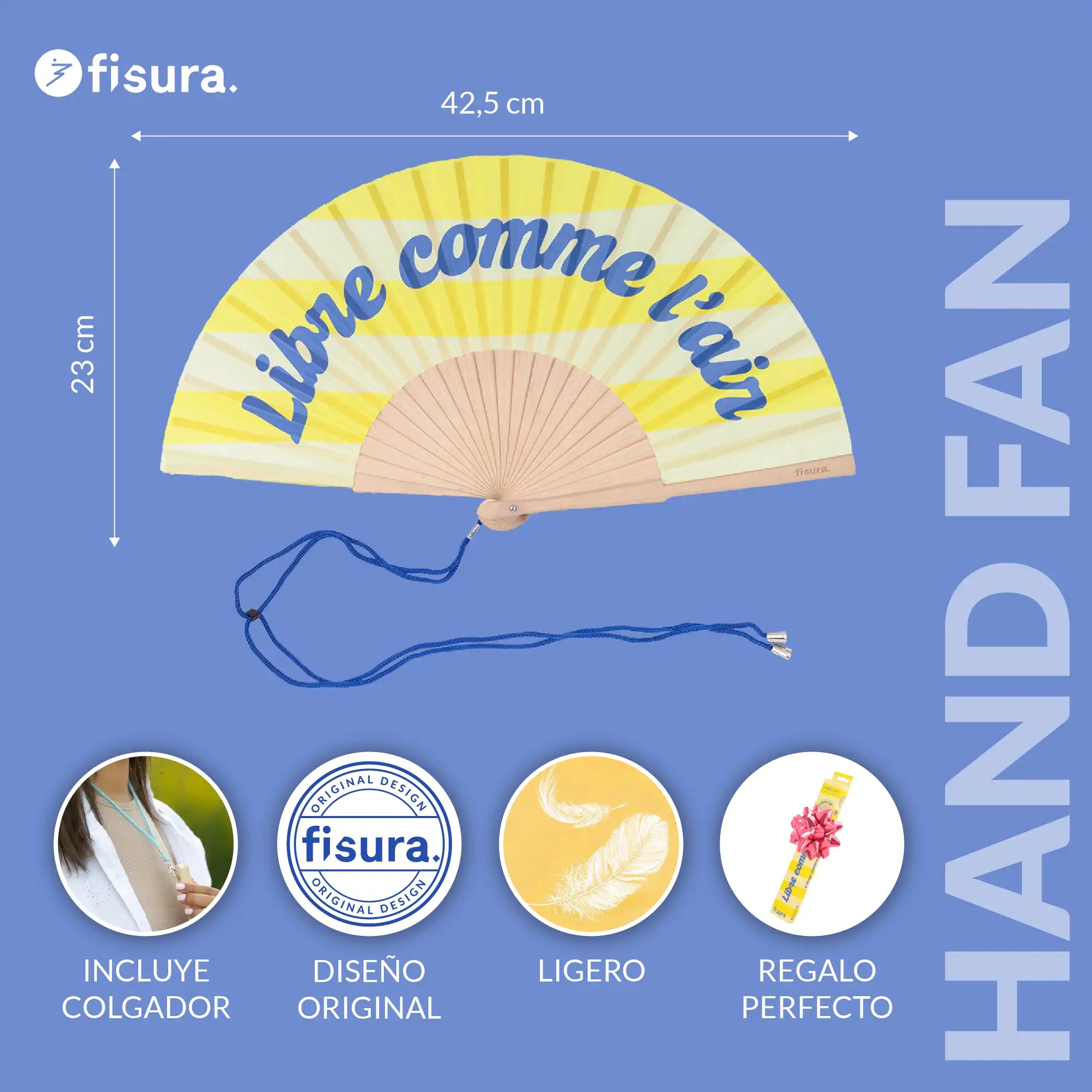 Recuerda que el verano es para fluir, disfrutar y sentirte tan libre como el viento con este abanico con mensaje “libre comme l’air” 🌬️. Lleva contigo este abanico de rayas blancas y amarillas, vive sin ataduras y deja que el aire fresco te envuelva mientras dejas a un lado las preocupaciones.