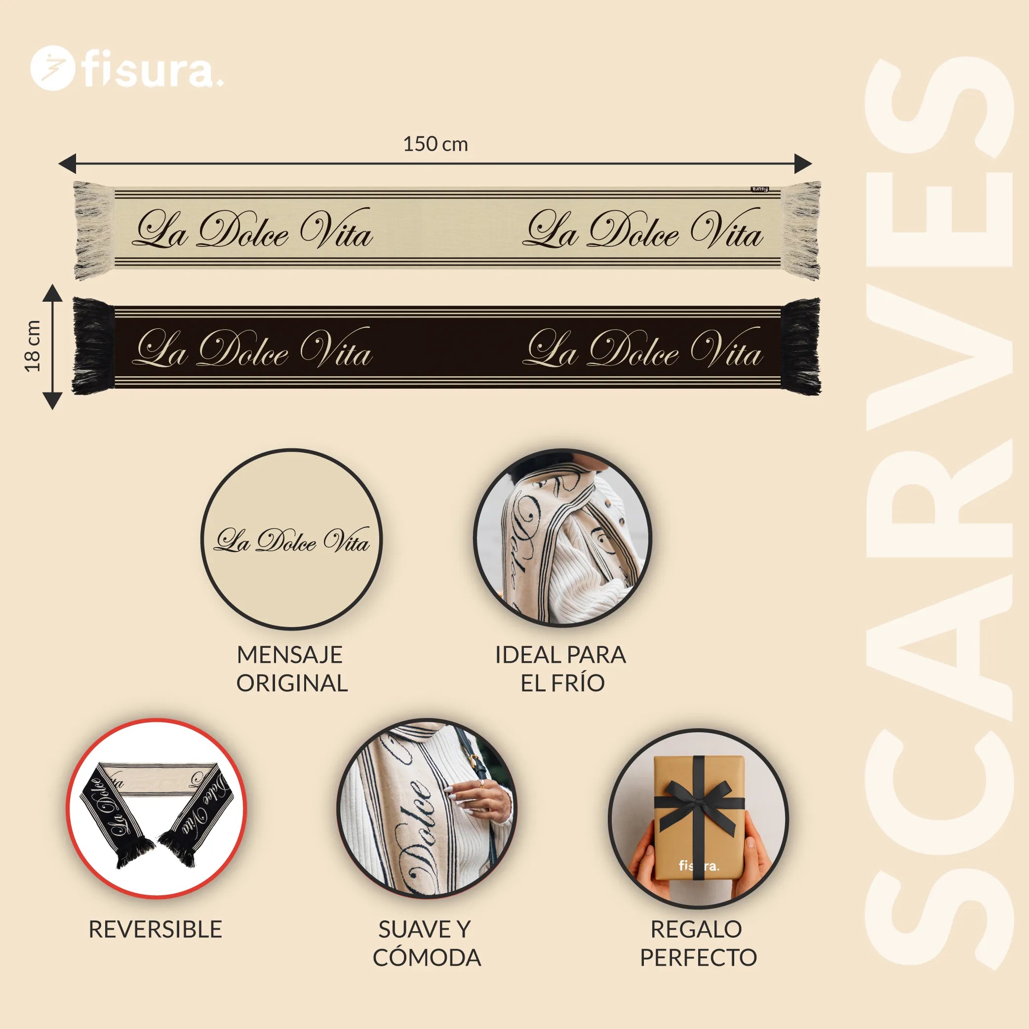 Si te encanta saborear los pequeños momentos de la vida, como un café caliente o el sol en un día frío, esta bufanda original con el mensaje “La dolce vita” 🍸 es tu aliada perfecta. ¡Y es reversible, por un lado negra y beige por el otro, por lo que se adaptará a tu outfit y le dará un toque único!