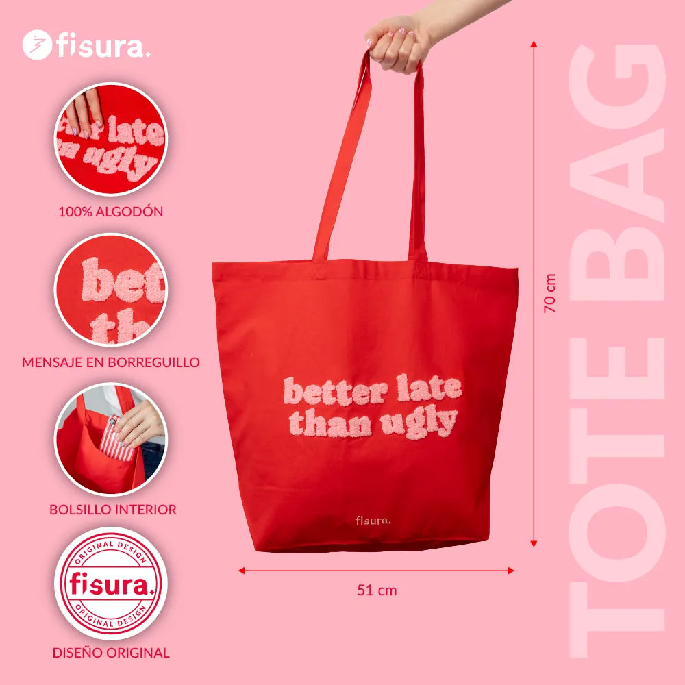 Deja claro con esta tote bag original con el mensaje en borreguillo “better late than ugly” que para ti llegar tarde está permitido… ¡pero salir sin estilo nunca 😎! Y, con la combinación del rojo y el rosa le da un toque alegre y atrevido a tus looks diarios, convirtiéndote en la reina de la impuntualidad con mucha actitud.