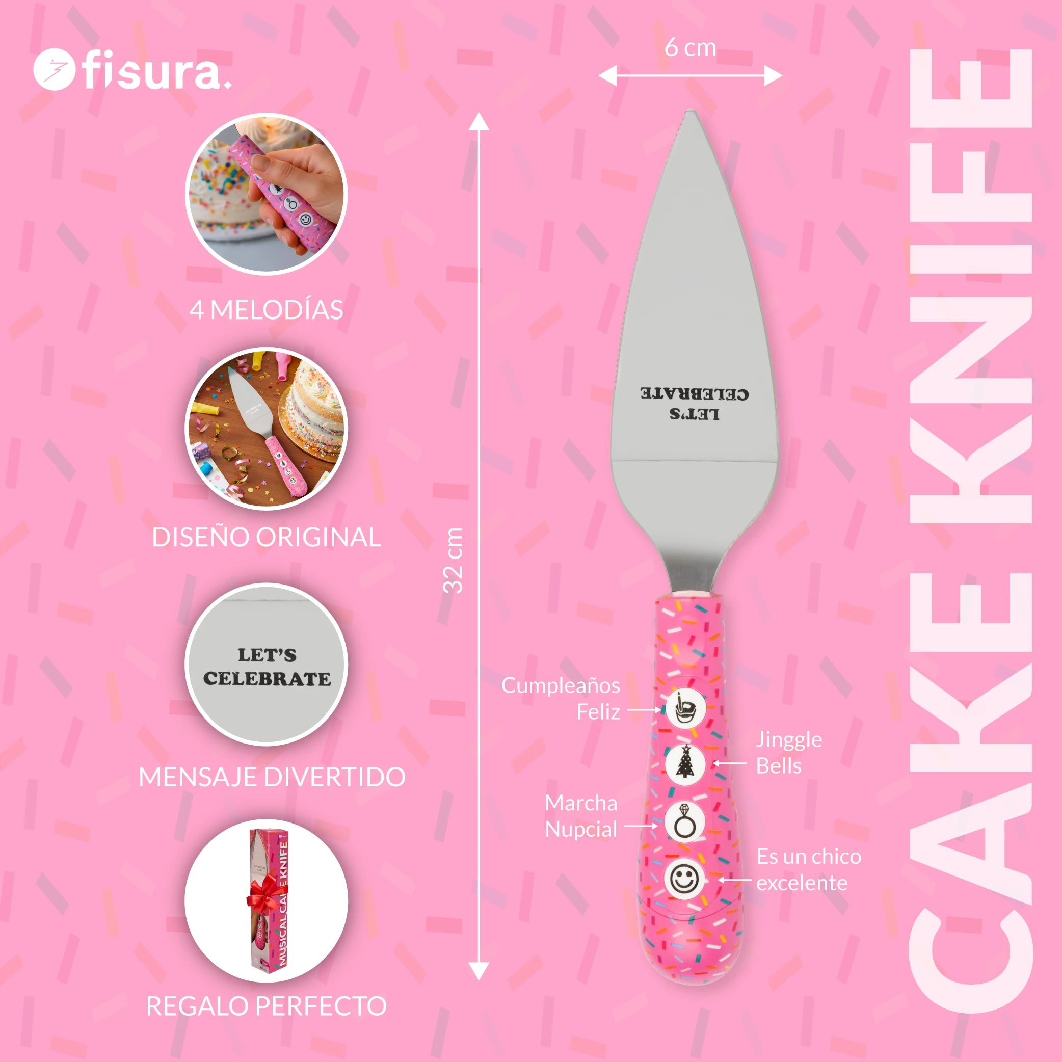 Convierte cualquier celebración en un fiestón con este cuchillo musical🎶. Desde “Feliz cumpleaños” hasta “Jingle Bells”, pasando por “La marcha nupcial” o “Es un muchacho excelente”, siempre tendrá la canción perfecta para acompañar cada momento y arrancar sonrisas desde la primera nota. Y, con su diseño con virutas de tarta 🍰 y el mensaje “Let’s celebrate” esta paleta de tarta con música se convertirá en el centro de atención de todas las fiestas.