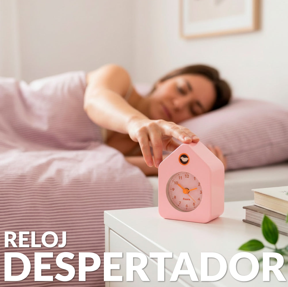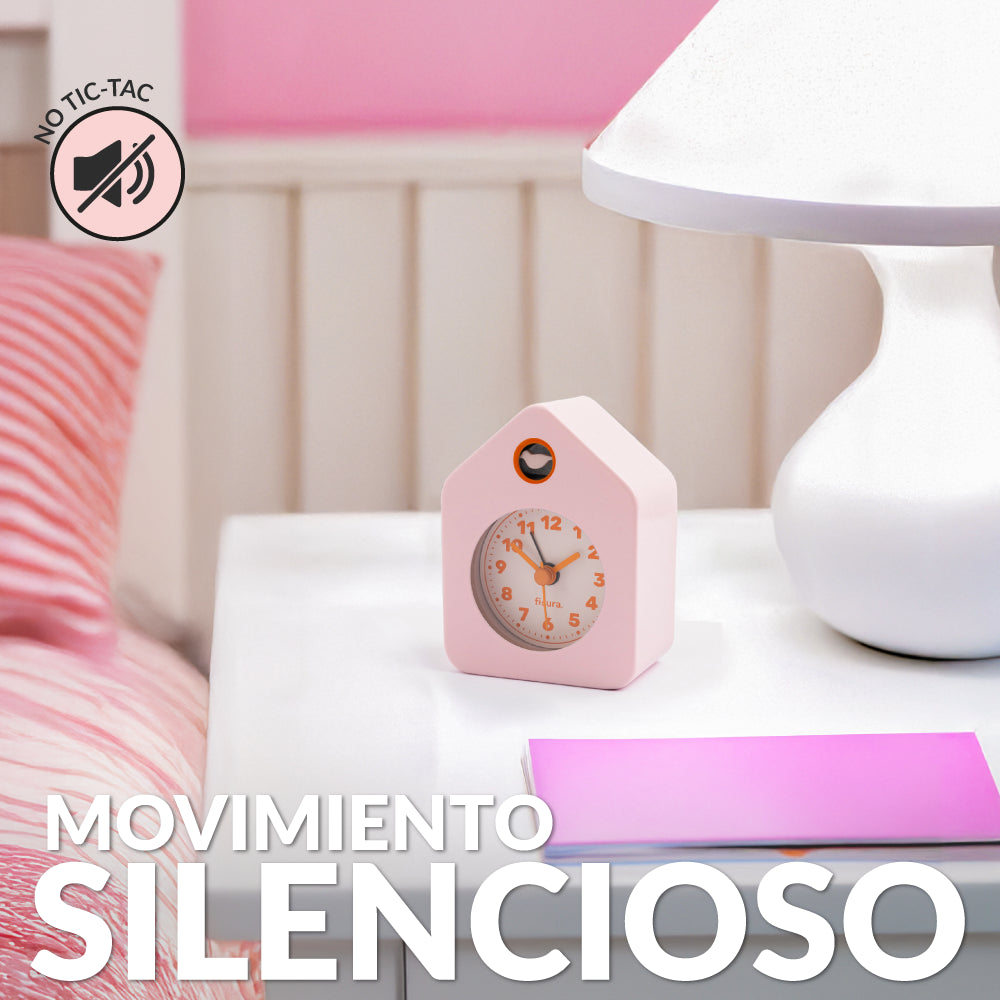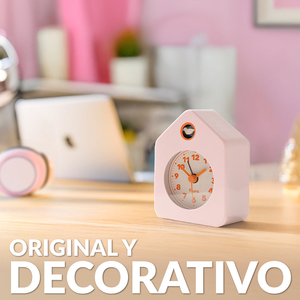 Con su adorable diseño de casita y sus tonos rosa y naranja, este despertador analógico ⏰ le dará a tu mesita de noche un toque de originalidad y color. Y lo mejor, es un despertador sin tic-tac, por lo que dormirás a pierna suelta sin que ningún ruido te despierte.