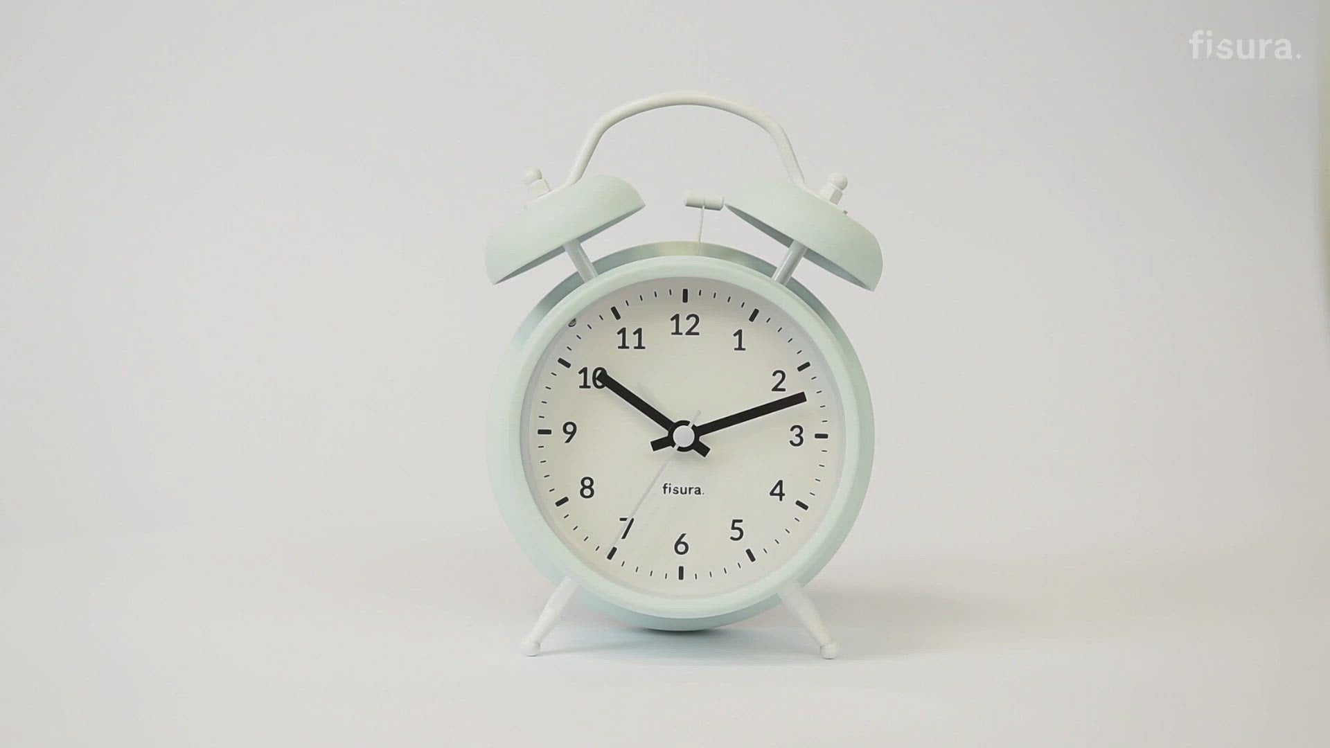 Reloj despertador azul menta con pequeños detalles en blanco.