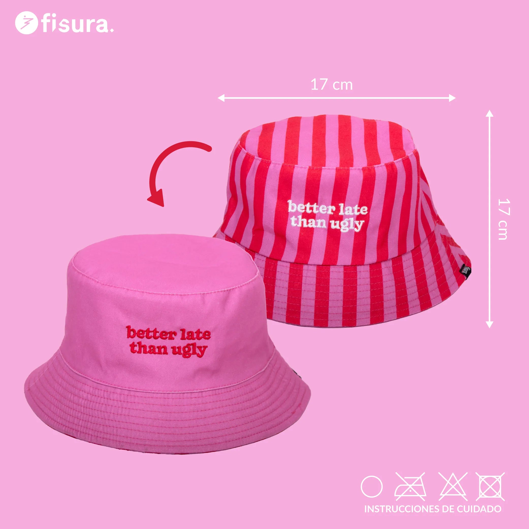 Este gorro de pescador es reversible, así que tienes dos looks en uno. Por un lado rayas rosas y rojas  llenas de personalidad y por el otro rosa para un estilo más minimal. Además, es talla única por lo que es ideal como gorro bucket de mujer (y también como gorro de pescador para hombre) ¡Es perfecto para protegerte del sol en la playa, en festivales, de paseo por la ciudad o en cualquier plan veraniego!