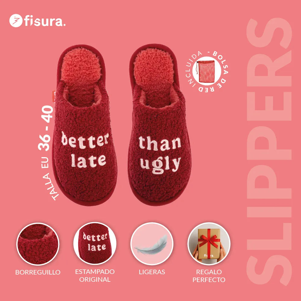 ¡Llegar tarde se perdona, pero llegar con cara de cansancio… jamás 😏! Con estas zapatillas de andar por casa rosas y rojas con el mensaje “better late than ugly” dejas claro que prefieres sofá, relax y buena cara antes que ir hecha un cuadro a cualquier sitio… ¡porque el descanso es clave para lucir ideal!