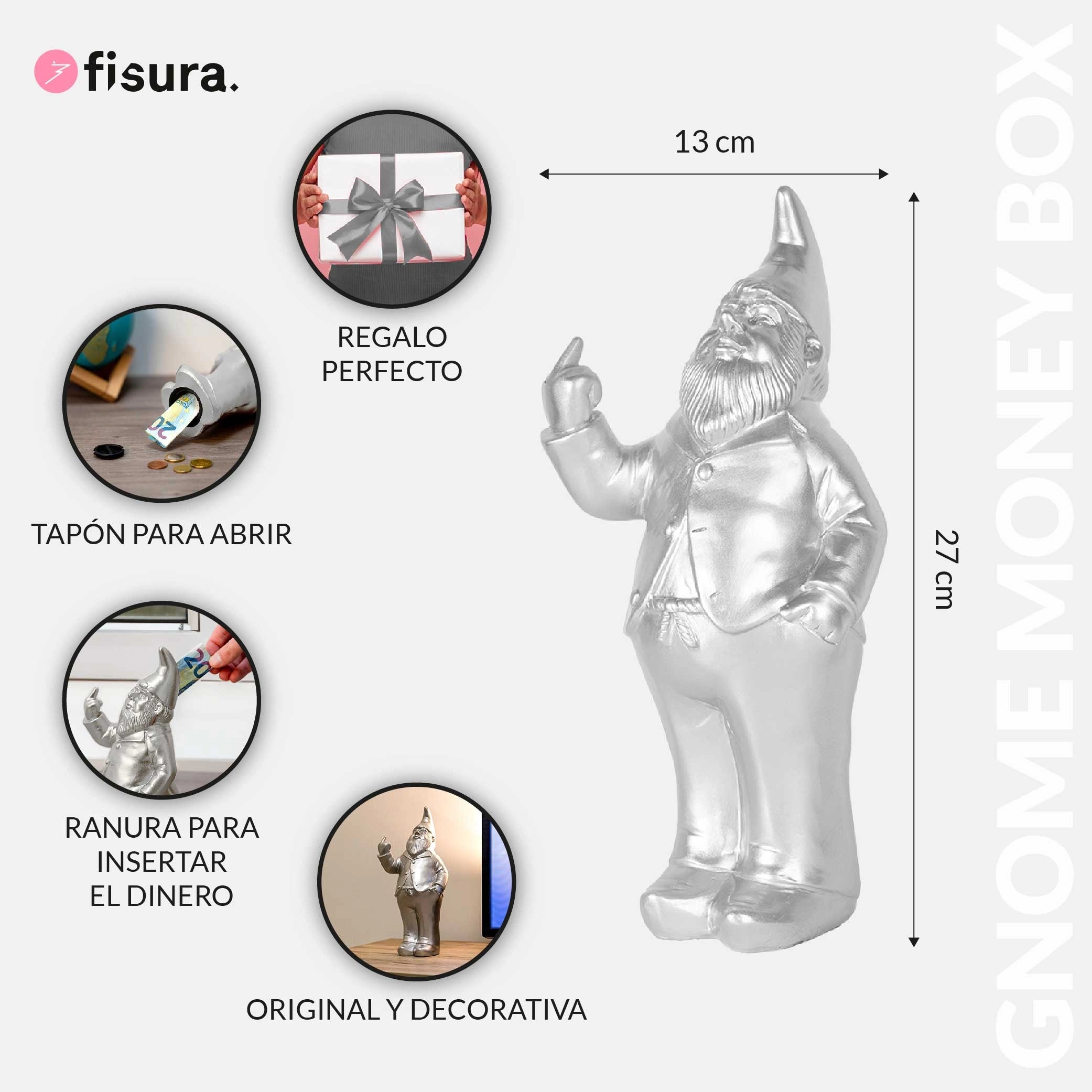 Perfecta para los más únicos y auténticos, ¡la hucha original tiene ese aire canalla que tanto te gusta! Con su llamativo color plateado y la forma de gnomo rebelde llamará la atención de todas tus visitas. 💰