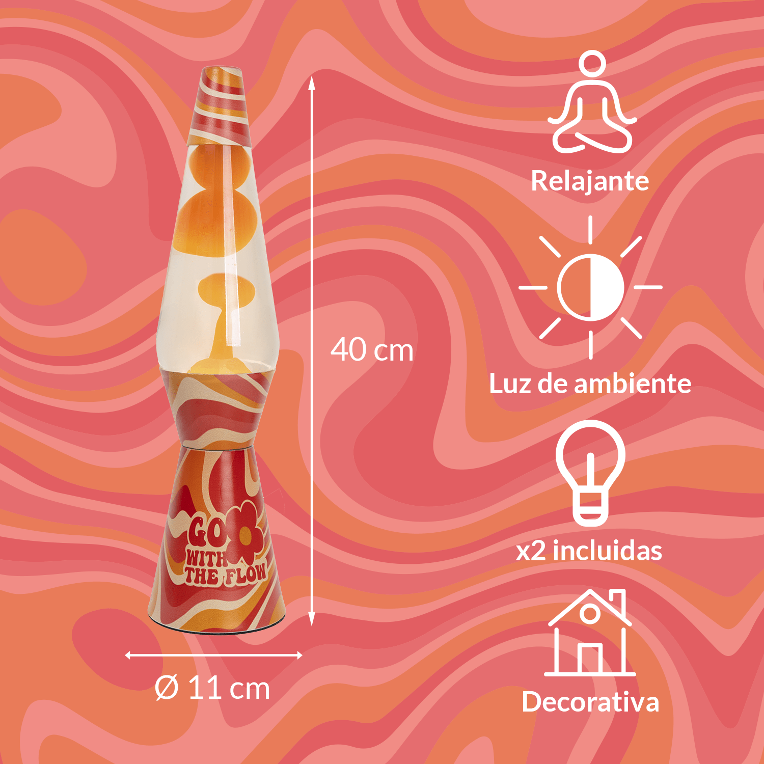 Déjate llevar y sumérgete en la energía del “go with the flow” con esta lámpara de lava multicolor. Su mensaje y sus tonos en rojo, rosa y naranja hacen a esta lámpara relajante un festival de colores que te transportará a la época retro, pero con un toque moderno y divertido.