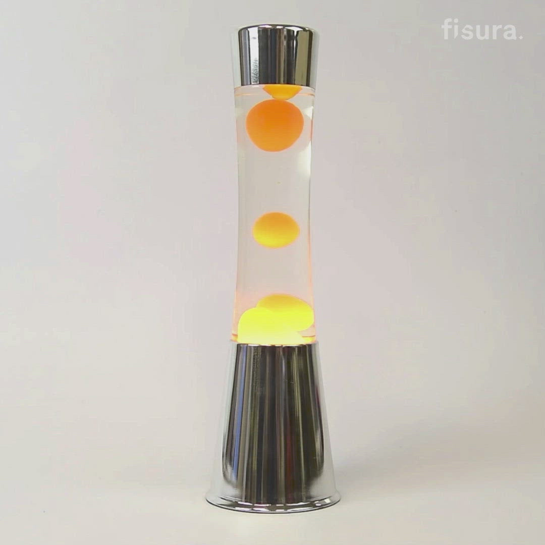 Lámpara de Lava con base cromo, líquido transparente y lava naranja