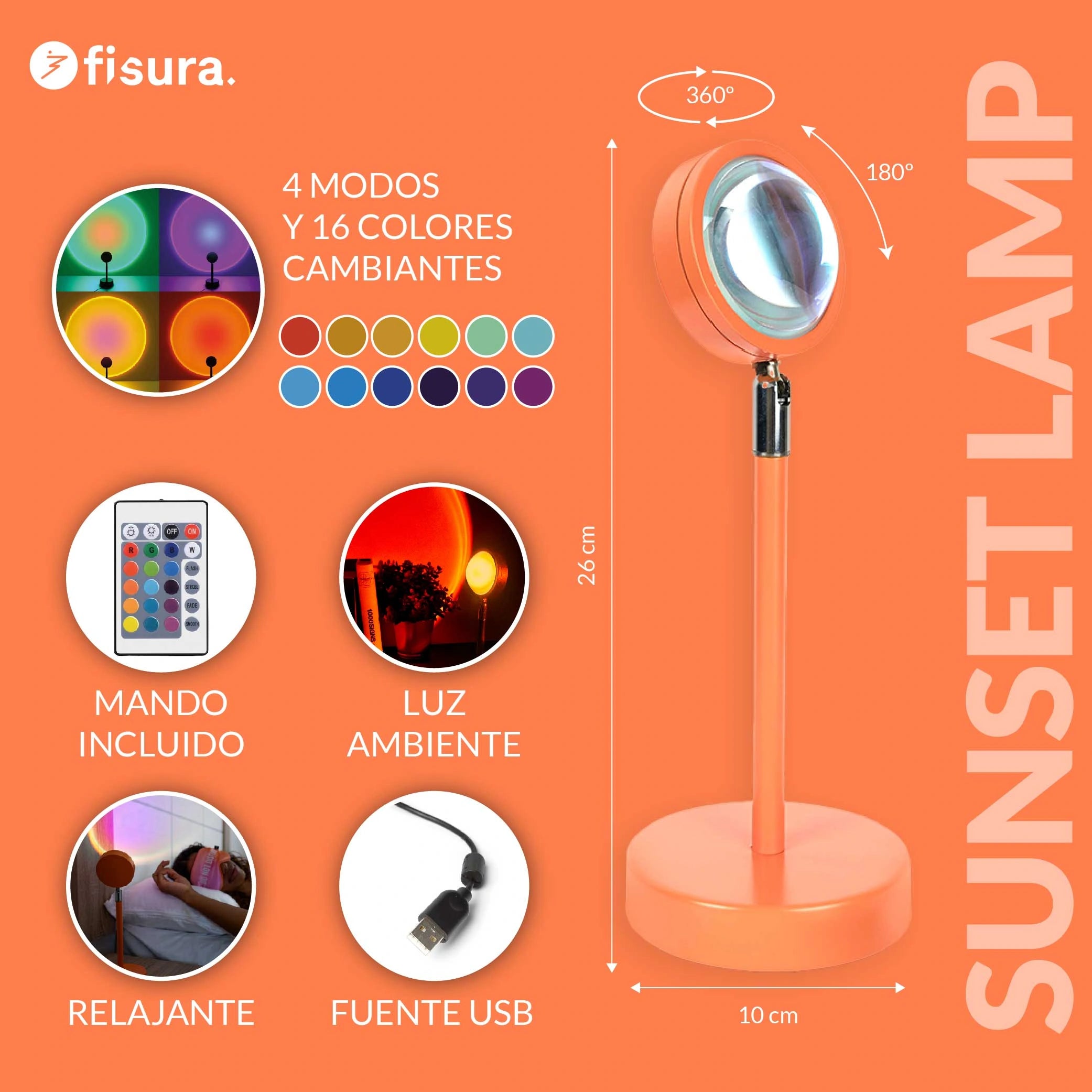 Transforma cualquier rincón de tu hogar con esta lámpara sunset con 16 colores distintos que van desde un relajante azul cielo hasta un cálido atardecer en la playa 🌅. Además, cuenta con 4 modos de luz diferentes y brillo ajustable. ¡Cambia el ambiente sin moverte del sofá con el mando a distancia y disfruta del espectáculo visual de la lámpara original!