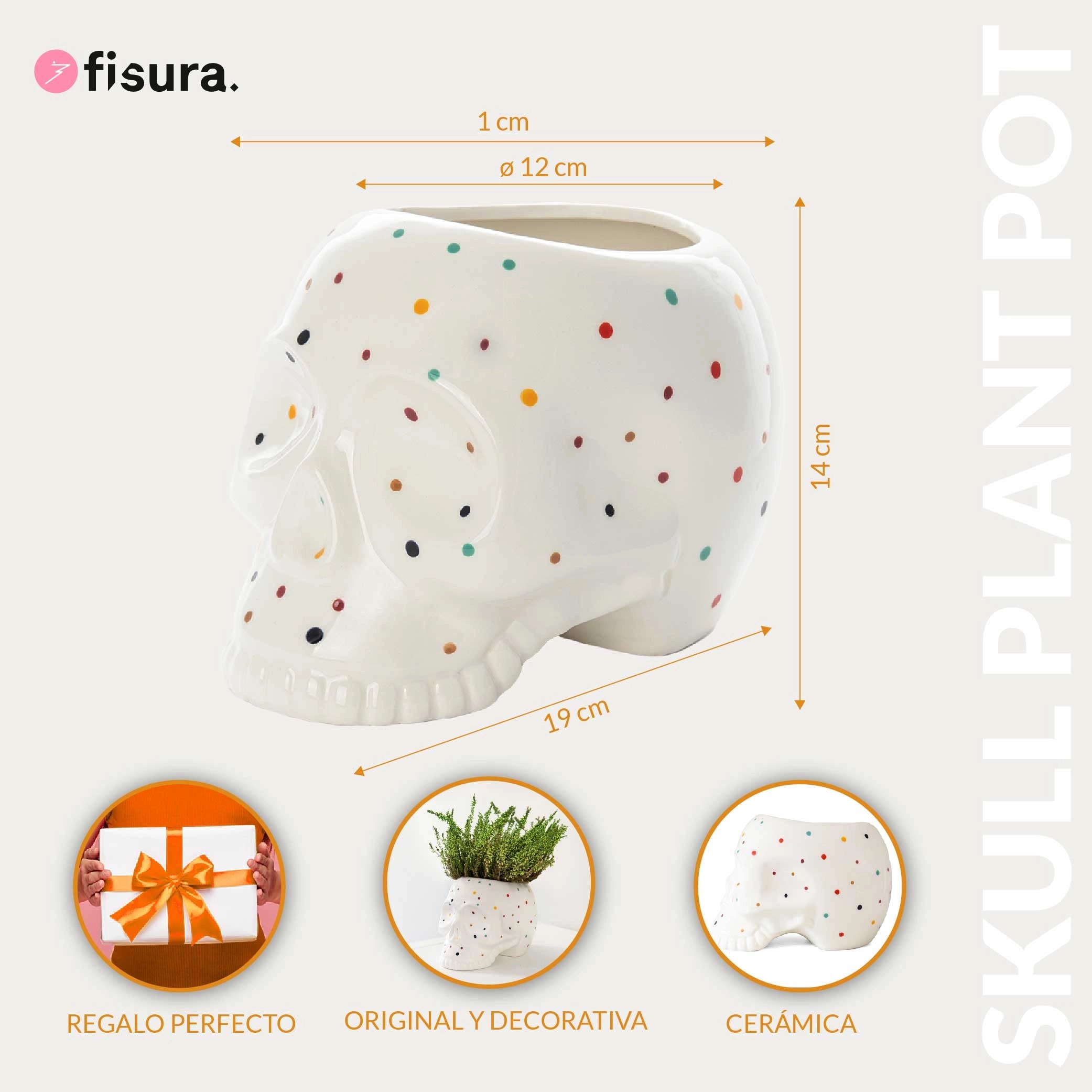 Con su color blanco y sus lunares de colores este macetero con forma de calavera ☠️ es ideal para darle un toque tétrico lleno de personalidad a tu salón, oficina, habitación o jardín. Además, tiene un diámetro de 12 cm lo que lo hace perfecto para pequeñas plantas, suculentas y flores. ¡Pon tu planta favorita y dale vida a tu casa 💐!