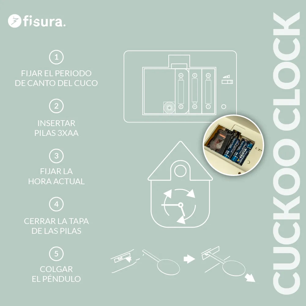 Es importante tener en cuenta que de forma automática el cuco canta durante 16 horas y se silencia 8 horas. Si quiere que su reloj esté silenciado por la noche debe introducir las pilas por primera vez teniendo en cuenta que a las 16h se silenciará y que, 8 horas después volverá a cantar. Por ejemplo, si marca las 7:45 al meter las pilas, sonará las 16 horas siguientes 8:00, 9:00, etc. sonando la última vez a las 23:00 y estando silenciado hasta las 8:00 de nuevo