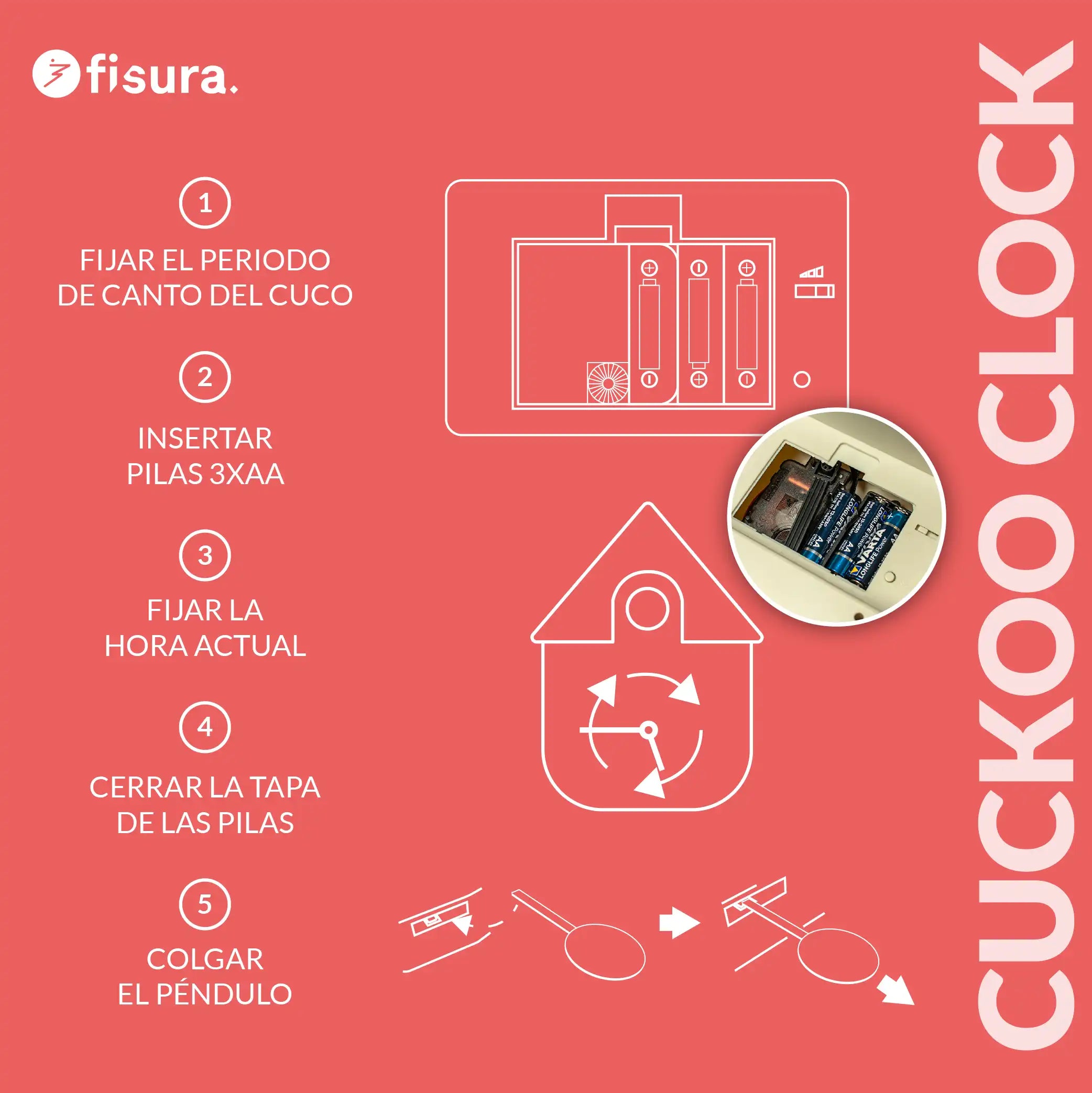 Es importante tener en cuenta que de forma automática el cuco canta durante 16 horas y se silencia 8 horas. Si quiere que su reloj esté silenciado por la noche debe introducir las pilas por primera vez teniendo en cuenta que a las 16h se silenciará y que, 8 horas después volverá a cantar. Por ejemplo, si marca las 7:45 al meter las pilas, sonará las 16 horas siguientes 8:00, 9:00, etc. sonando la última vez a las 23:00 y estando silenciado hasta las 8:00 de nuevo