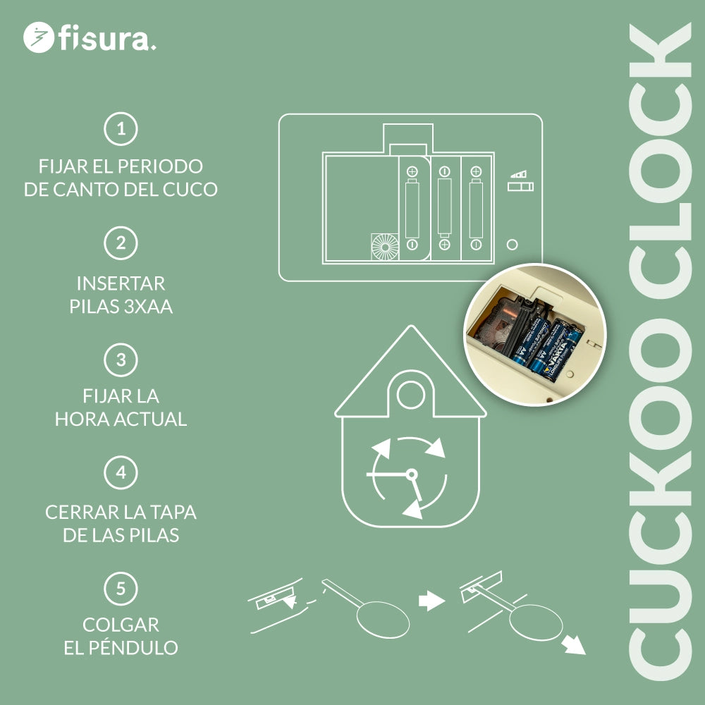 Es importante tener en cuenta que de forma automática el cuco canta durante 16 horas y se silencia 8 horas. Si quiere que su reloj esté silenciado por la noche debe introducir las pilas por primera vez teniendo en cuenta que a las 16h se silenciará y que, 8 horas después volverá a cantar. Por ejemplo, si marca las 7:45 al meter las pilas, sonará las 16 horas siguientes 8:00, 9:00, etc. sonando la última vez a las 23:00 y estando silenciado hasta las 8:00 de nuevo