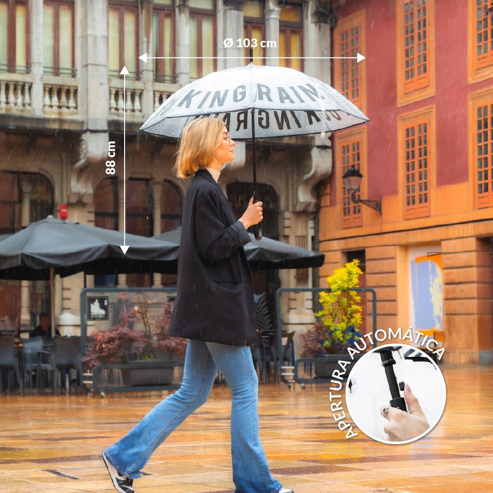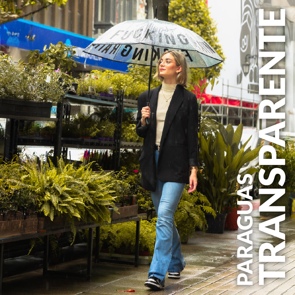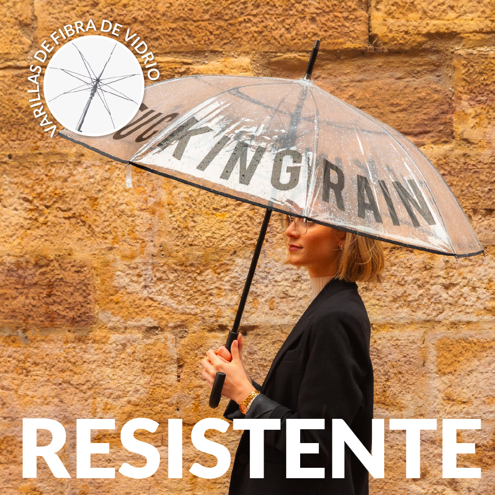 ¡Que la lluvia no estropee tus planes! Coge tu paraguas transparente grande con el mensaje “fucking rain” y camina bajo el agua sin perderte nada de lo que suceda a tu alrededor mientras dejas claro que odias el mal tiempo🌧️.