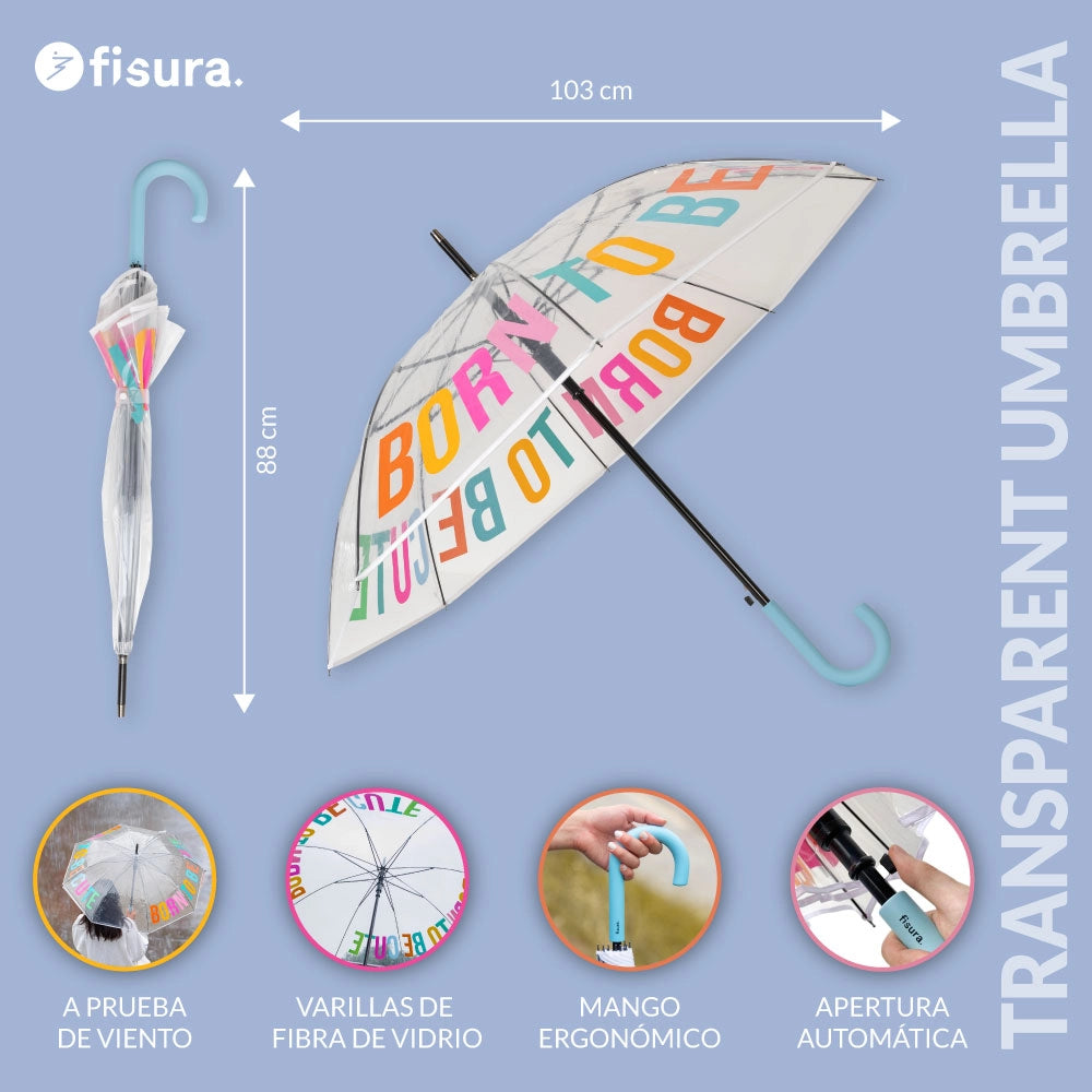 ¡Porque no hay tormenta que apague tu brillo ni gota que estropee tu outfit! Plántale cara a la lluvia con este paraguas transparente grande y su mensaje “born to be cute” que se convertirá en tu accesorio imprescindible en los días en los que el sol está missing.