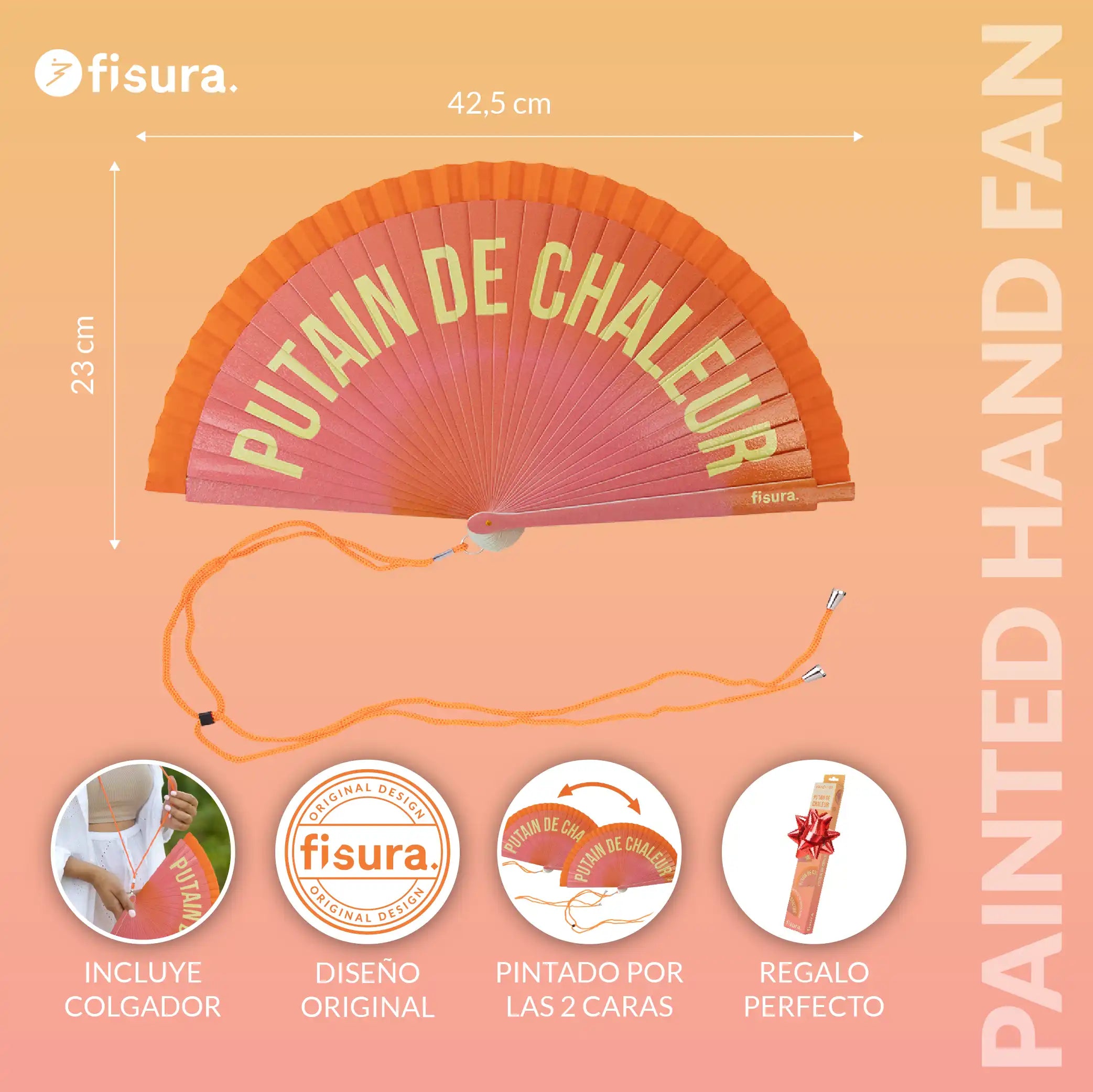 Abanico pintado "Putain de chaleur" degradado naranja
