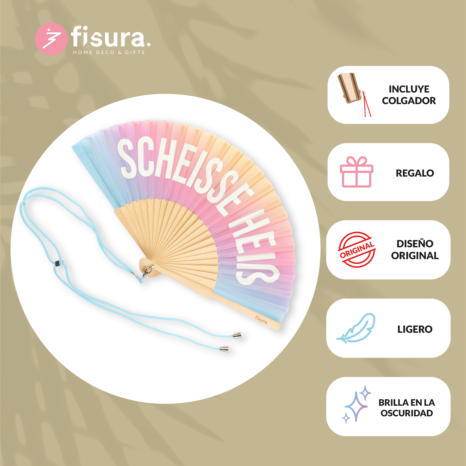 Con sus tonos degradados le dará a tus outfits un toque de color muy veraniego y divertido. Lo mejor de todo: brilla en la oscuridad! ✨, por lo que este abanico original es ideal para las noches de verano en las que los termómetros no dan tregua. Además, incluye un práctico colgador para que puedas tenerlo siempre a mano y que no se te pierda ni se te olvide.