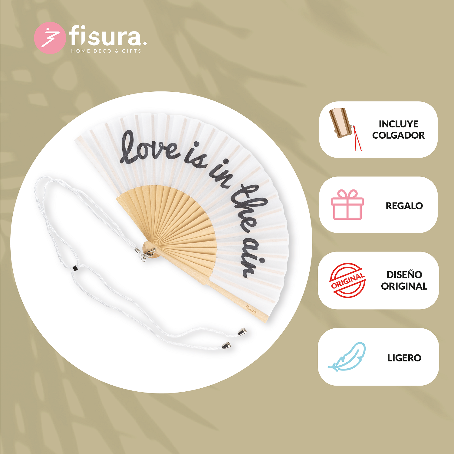 Con su mensaje “love is in the air” el abanico blanco creará un ambiente aún más mágico y lleno de amor. Además, incluye un práctico colgador para que puedas bailar y disfrutar del cóctel con las manos libres👯.
