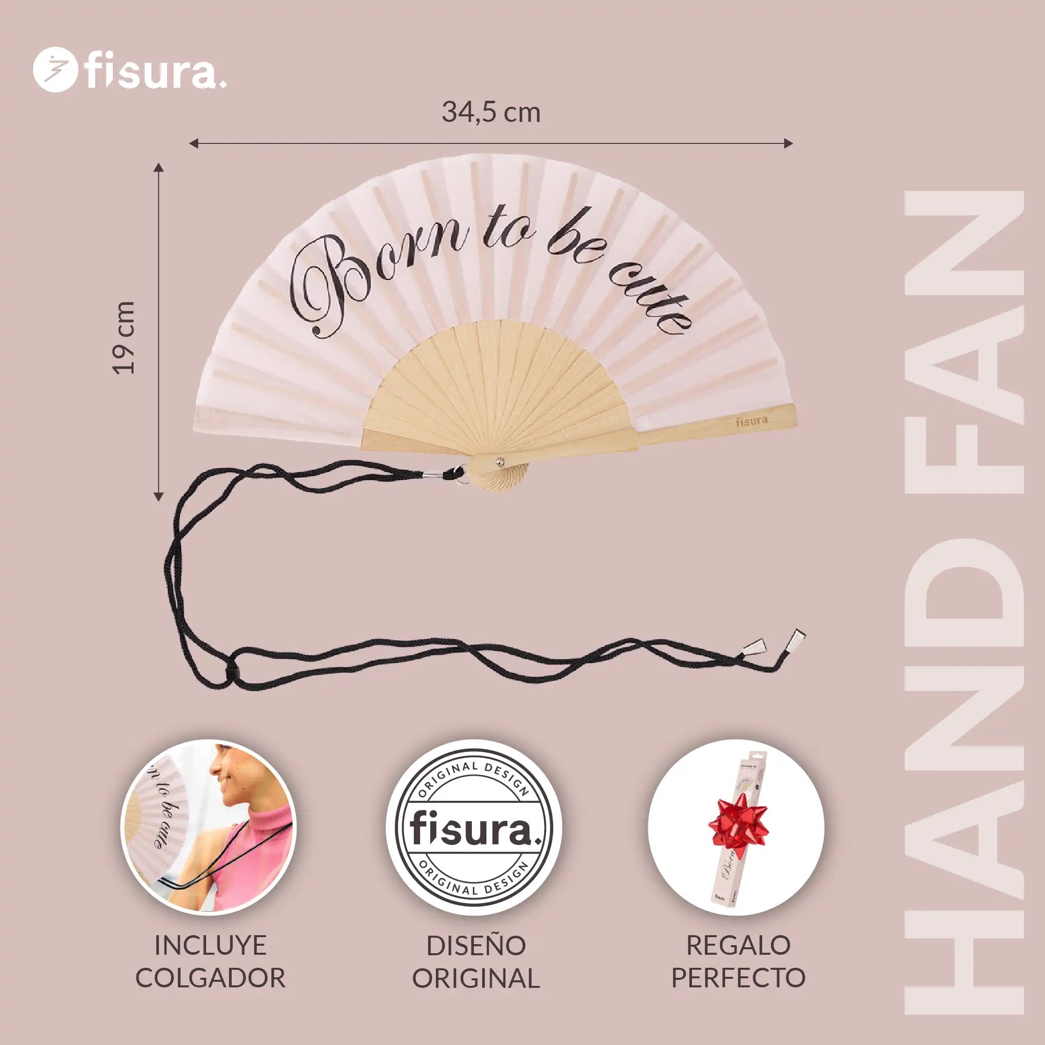 El abanico mini tiene un tamaño de 19 cm x 3 cm cuando está cerrado por lo que es ideal para llevarlo en cualquier bolso pequeño👝, riñonera, mochila o bolsillo del traje. Y, con su mensaje “born to be cute” 🎀 dejarás claro que derrochas simpatía y que eres adorable.