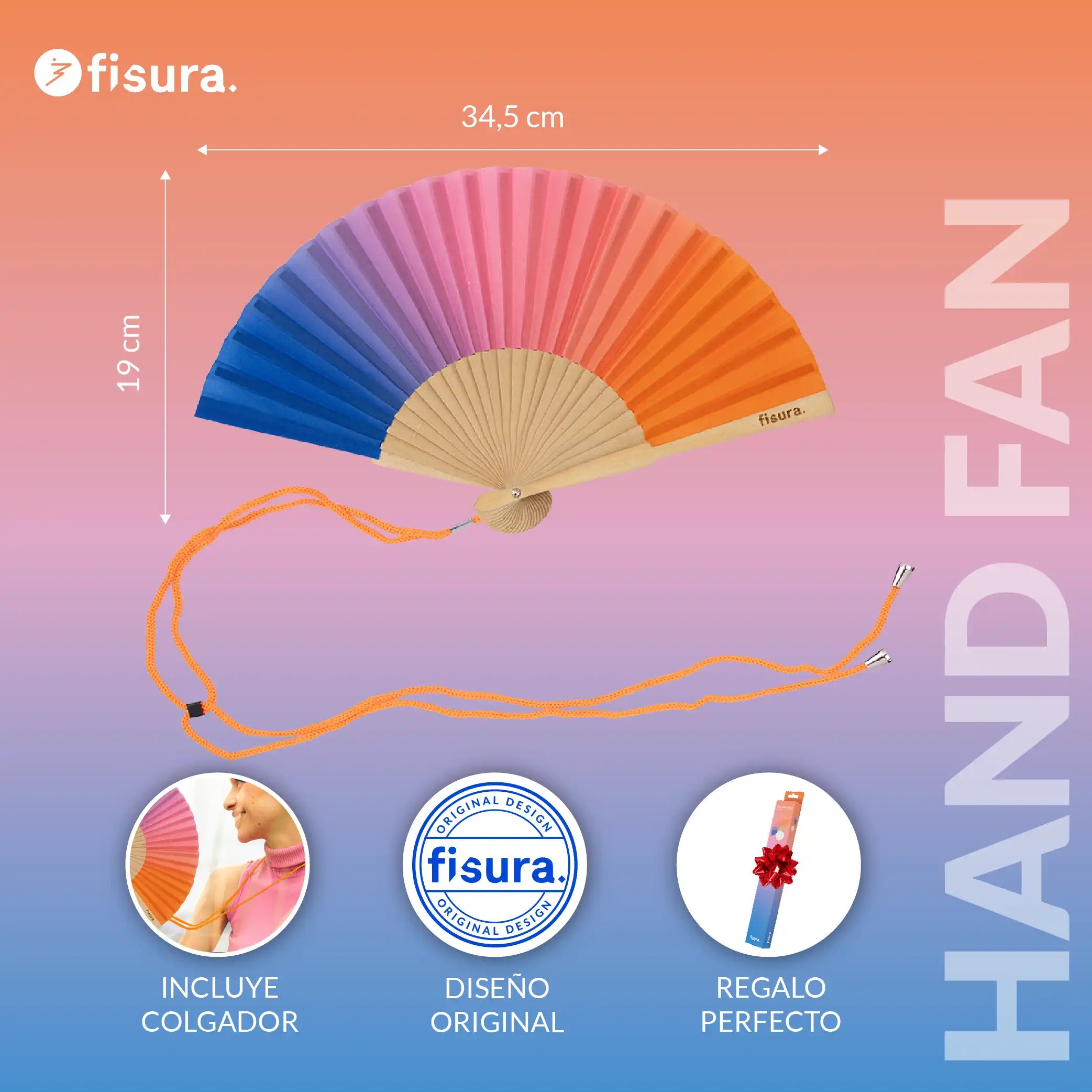 El abanico mini tiene un tamaño de 19 cm x 3 cm cuando está cerrado por lo que es ideal para llevarlo en cualquier bolso pequeño👝, riñonera, mochila o bolsillo del traje. Y, con su estampado degradado del azul al rosa le dará a tus looks veraniegos un toque de alegría y color que llamará la atención allá donde vayas.