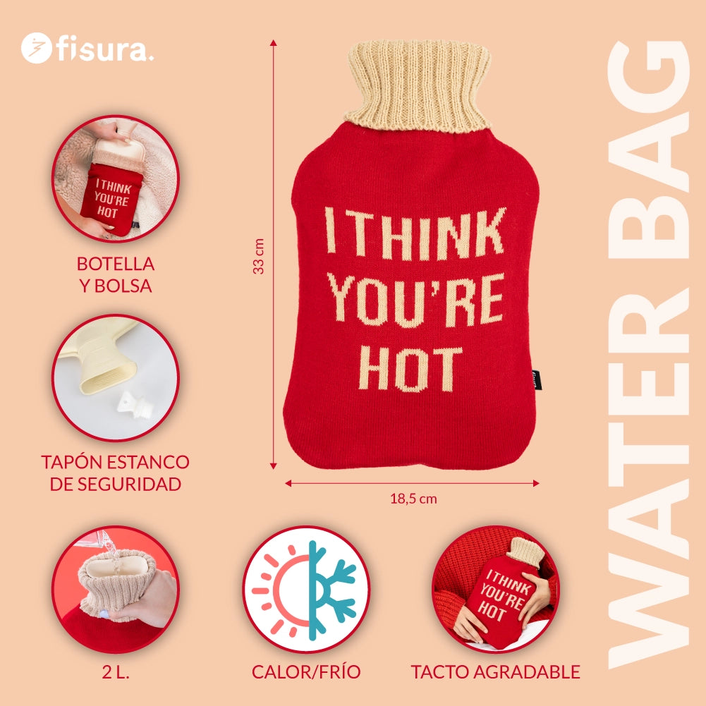 ¡Desafía las bajas temperaturas con esta bolsa de agua caliente original 🔥! Su mensaje “I think you're hot” dejará claro que te ves increíble. Además, gracias a su capacidad de 2 litros y su funda poliéster roja y beige se convertirá en tu aliada para enfrentarte a las noches más frías.