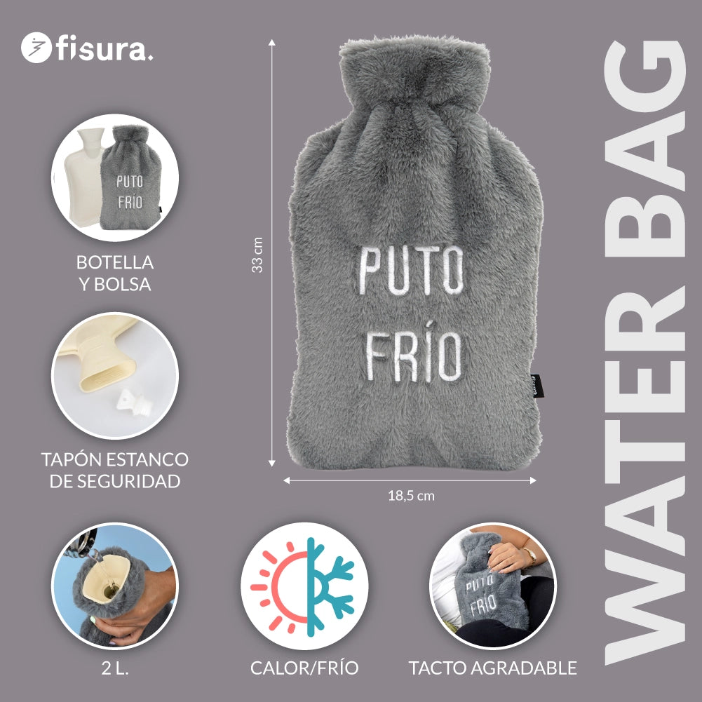 ¡Desafía las bajas temperaturas con esta bolsa de agua caliente original 🔥!. Su mensaje “puto frío” dejará claro tu “hate” por las bajas temperaturas. Además, gracias a su capacidad de 2 litros y su funda de felpa gris se convertirá en tu aliada para enfrentarte a las noches más frías.