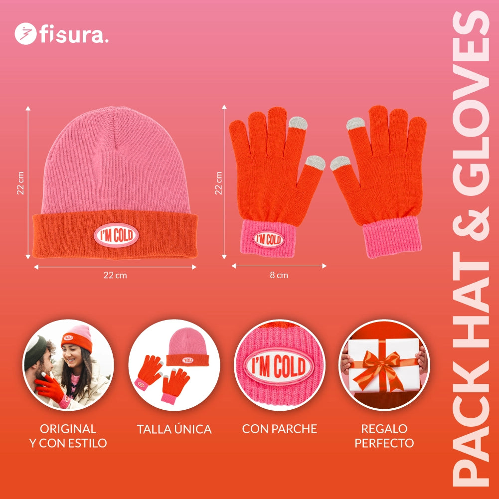Pack de gorro y guantes “I’m cold” rosa y rojo