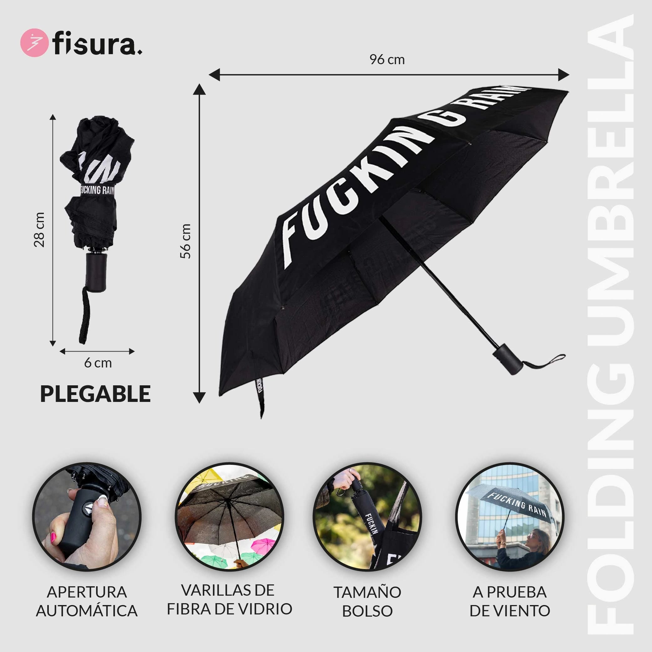 ¡Que la lluvia no estropee tus planes! Coge tu paraguas original, ponte las botas y sal a conquistar el mundo bajo la lluvia. Con su color negro y el mensaje “fucking rain” un toque hater y divertido a tu look mientras dejas claro que odias el mal tiempo.