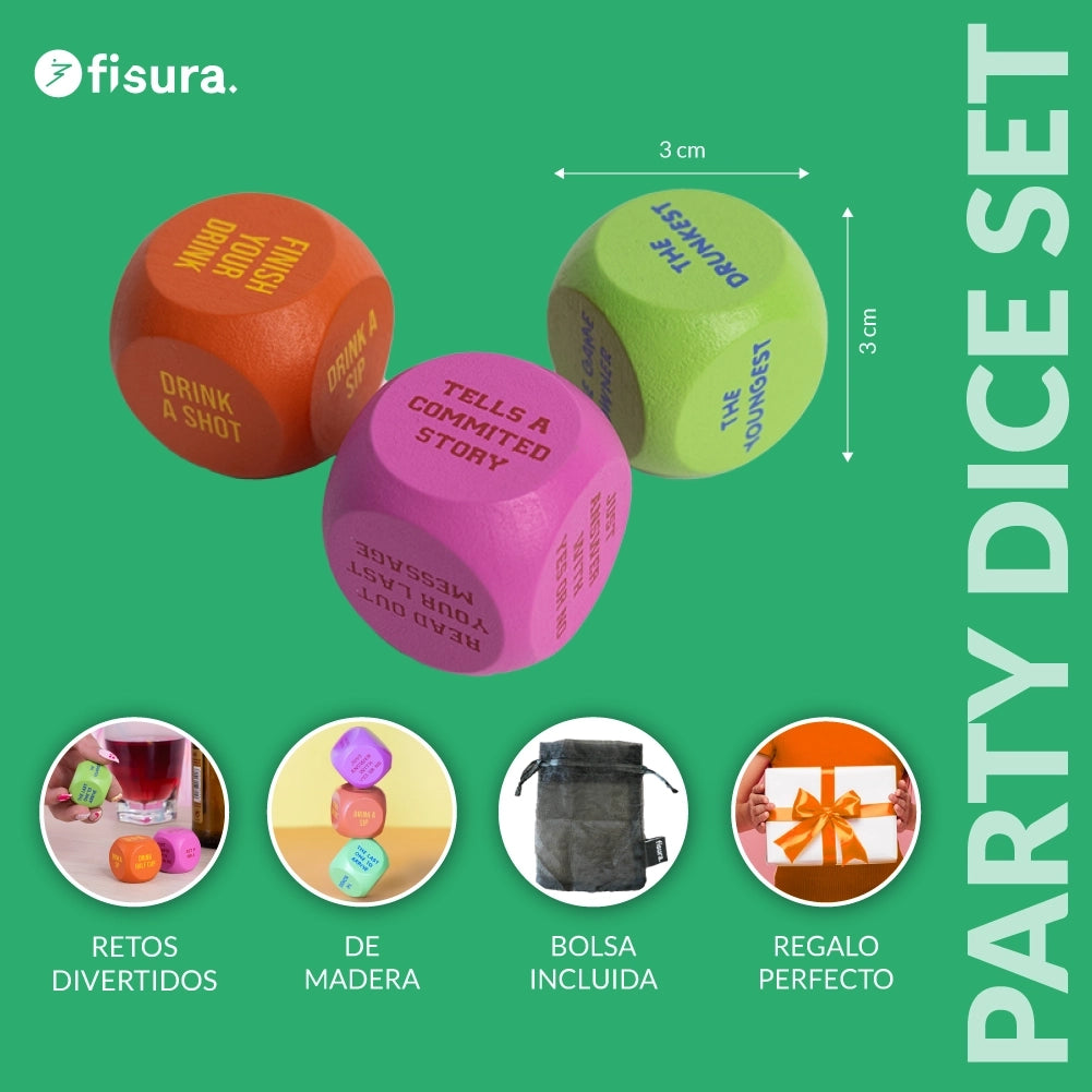 Este set incluye tres dados: uno para decidir quién bebe (el más rubio, el que llegó último…), otro para cuánto beber (bebe media copa, toma dos chupitos) y un último dado con un reto divertido. ¡Tíralos todos y prepárate para una noche llena de risas y brindis 🥂!