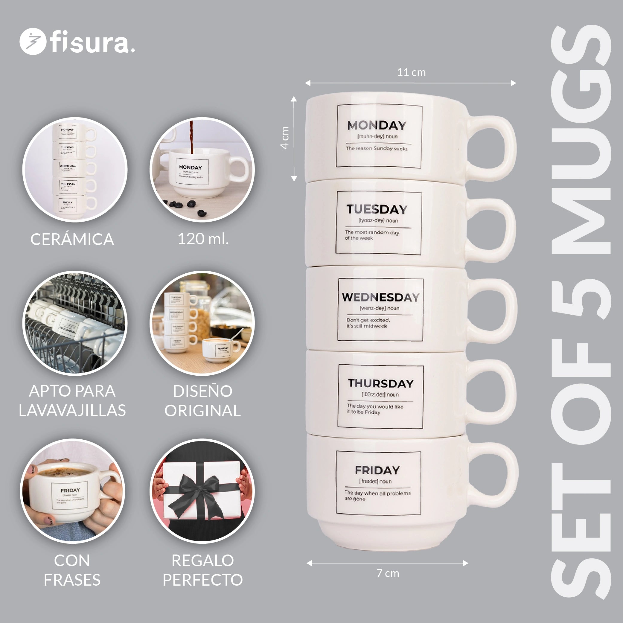 Dale un toque divertido a tus mañanas con este set de 5 tazas blancas, cada una con un día de la semana 📅 y su definición. Desde "Monday - The reason Sunday sucks" hasta "Friday – The day when all problems are gone” estas tazas te acompañarán de lunes a viernes, recordándote que cada día tiene su propio mood.