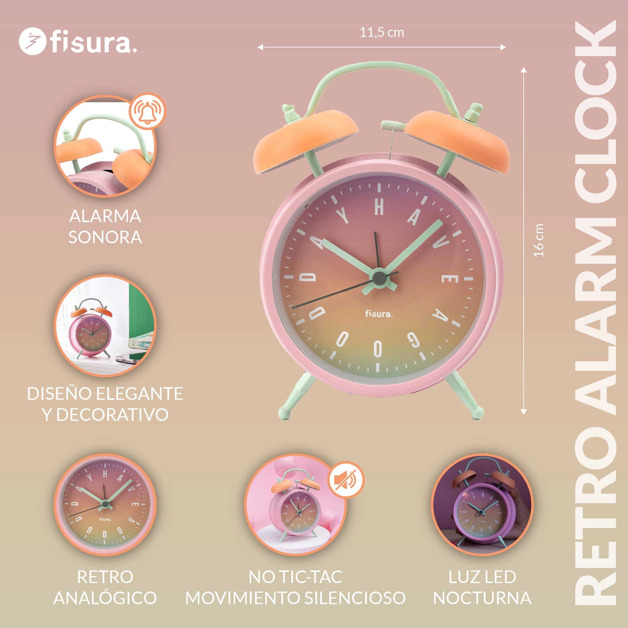 Con sus tonos degradados este despertador rosa es ideal para darle un toque de color y alegría a tu mesita de noche. Además, su diseño retro te recordará al clásico despertador de agujas que alguna vez tuviste.