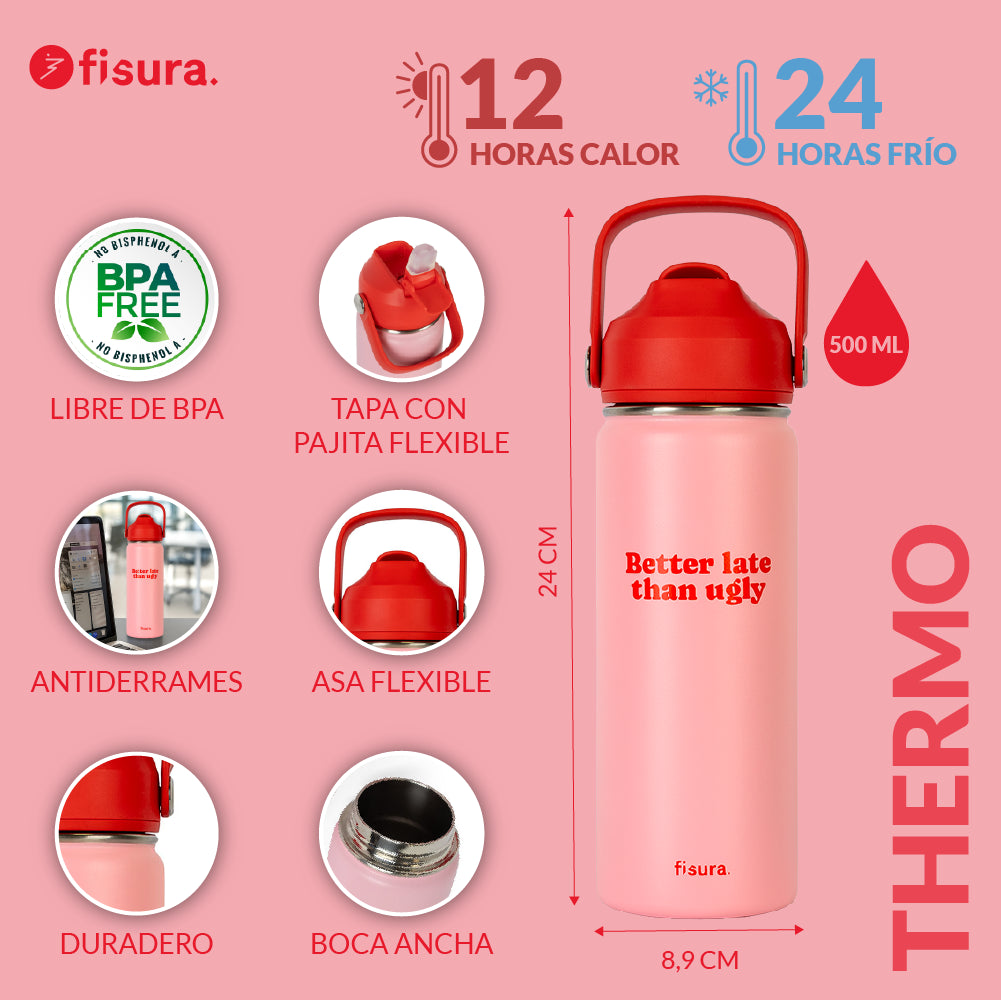 Deja claro prefieres llegar tarde a hacerlo sin arreglar con este termo con mensaje “better late than ugly” y es que… ¡antes muerta que sencilla 💄! Además, gracias a su asa podrás llevar esta botella de agua térmica contigo a todas partes ¡y con sus tonos rosa y rojo le darás a tus looks un toque moderno y colorido!