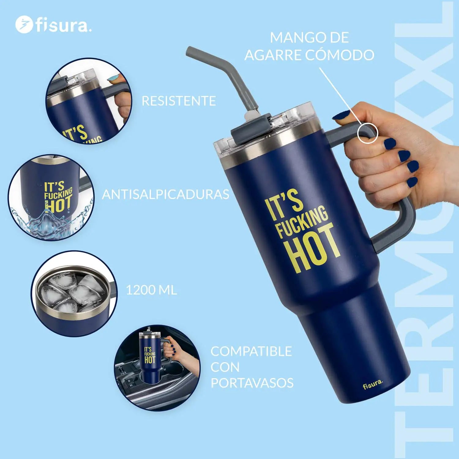 ¡Haz frente al calor con estilo 🔥! Esta botella de agua térmica con sus colores azul y amarillo, y el mensaje "it's fucking hot", es el accesorio de verano perfecto para mantenerte fresco en los días en los que el termómetro no baja y dale un toque de moderno y colorido a tus outfits.