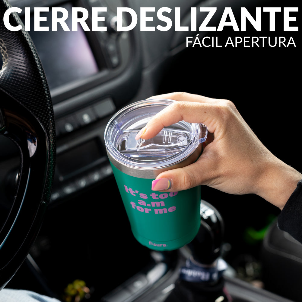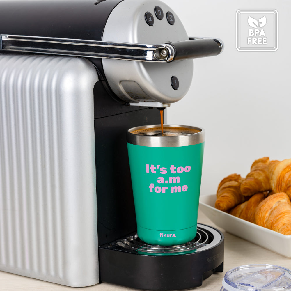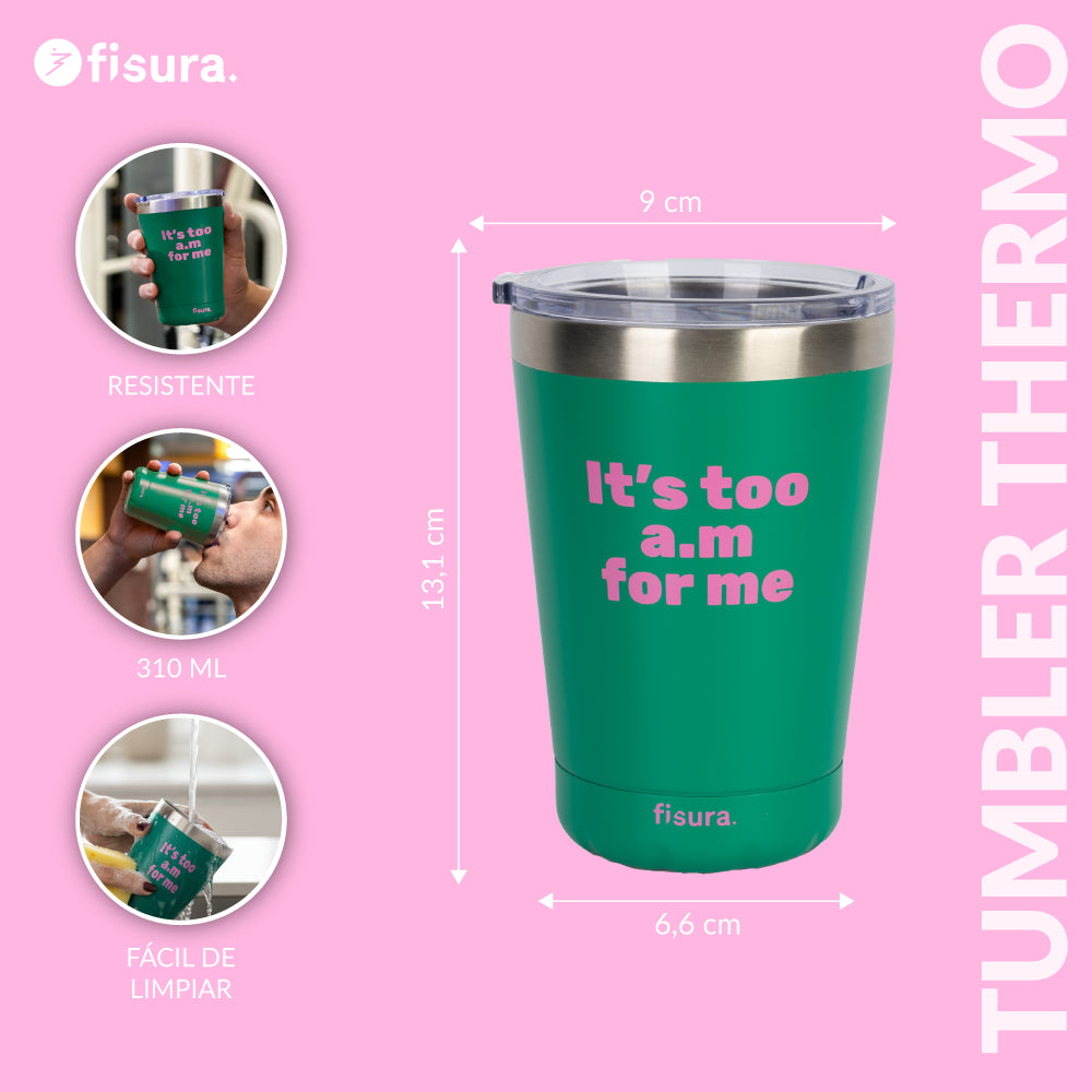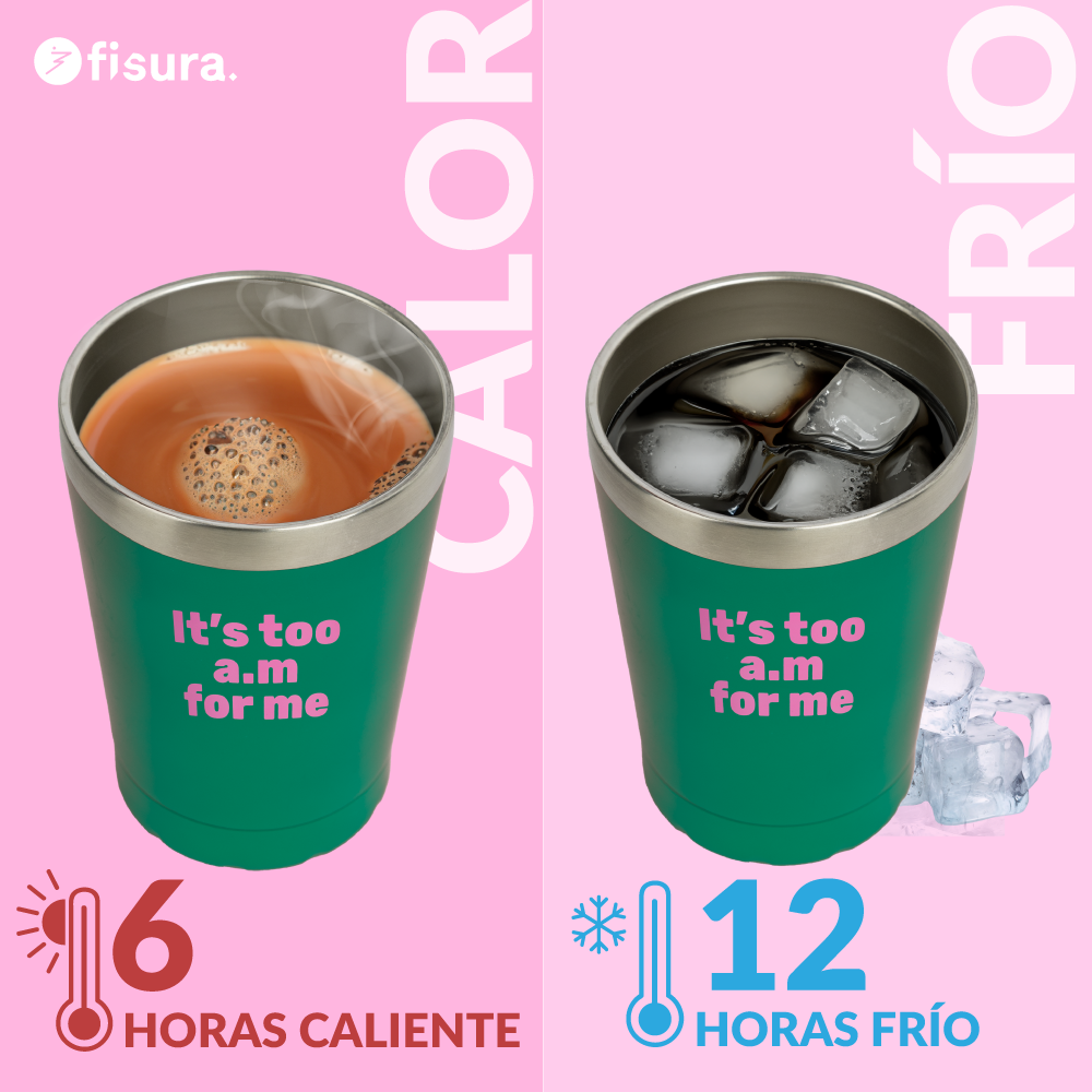 ¡Prepárate para darle un toque cañero y colorido a tus mañanas con este vaso térmico de café ☕! Con sus colores verde y rosa, no solo mantendrá tu bebida caliente, sino que también añadirá originalidad a tu rutina matutina. Además, con su mensaje "It’s too a.m for me" dejarás claro que no eres amigo de los madrugones y necesitas cafeína para funcionar desde primera hora.