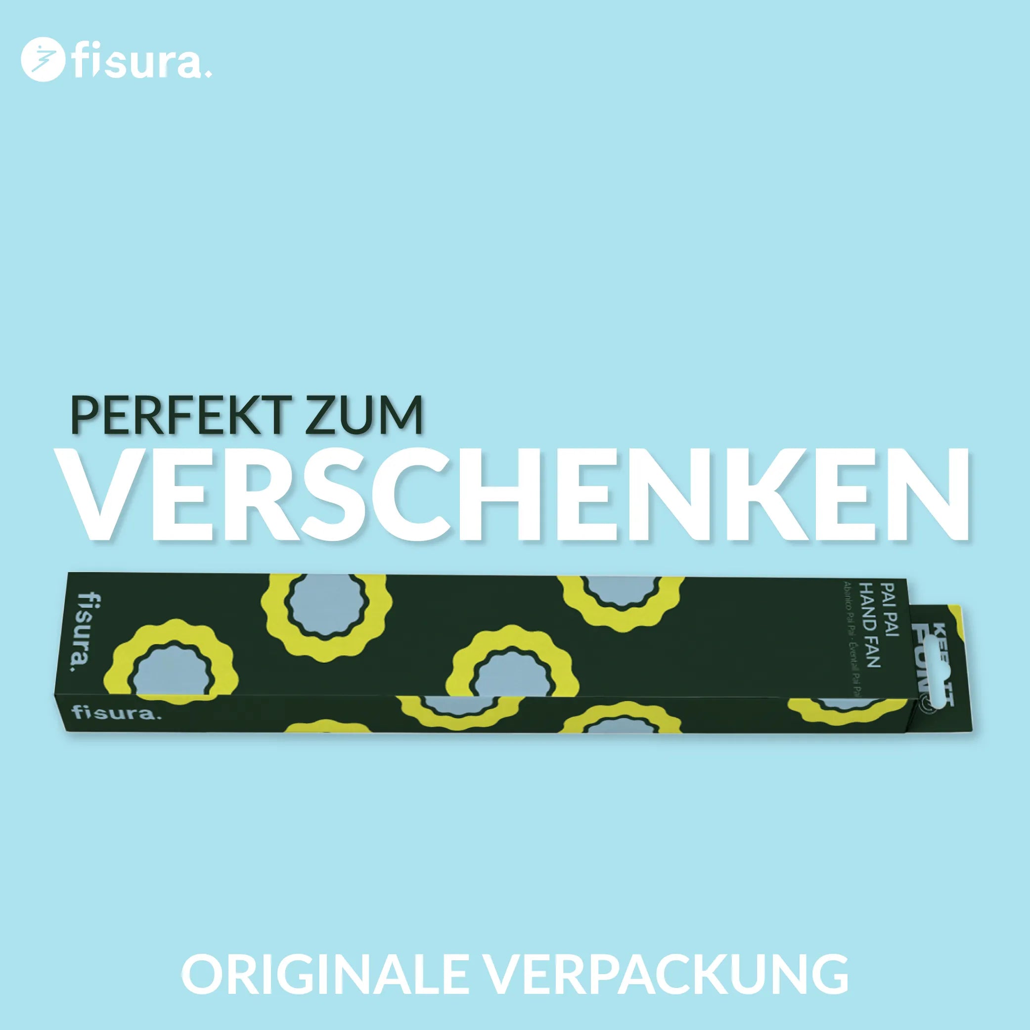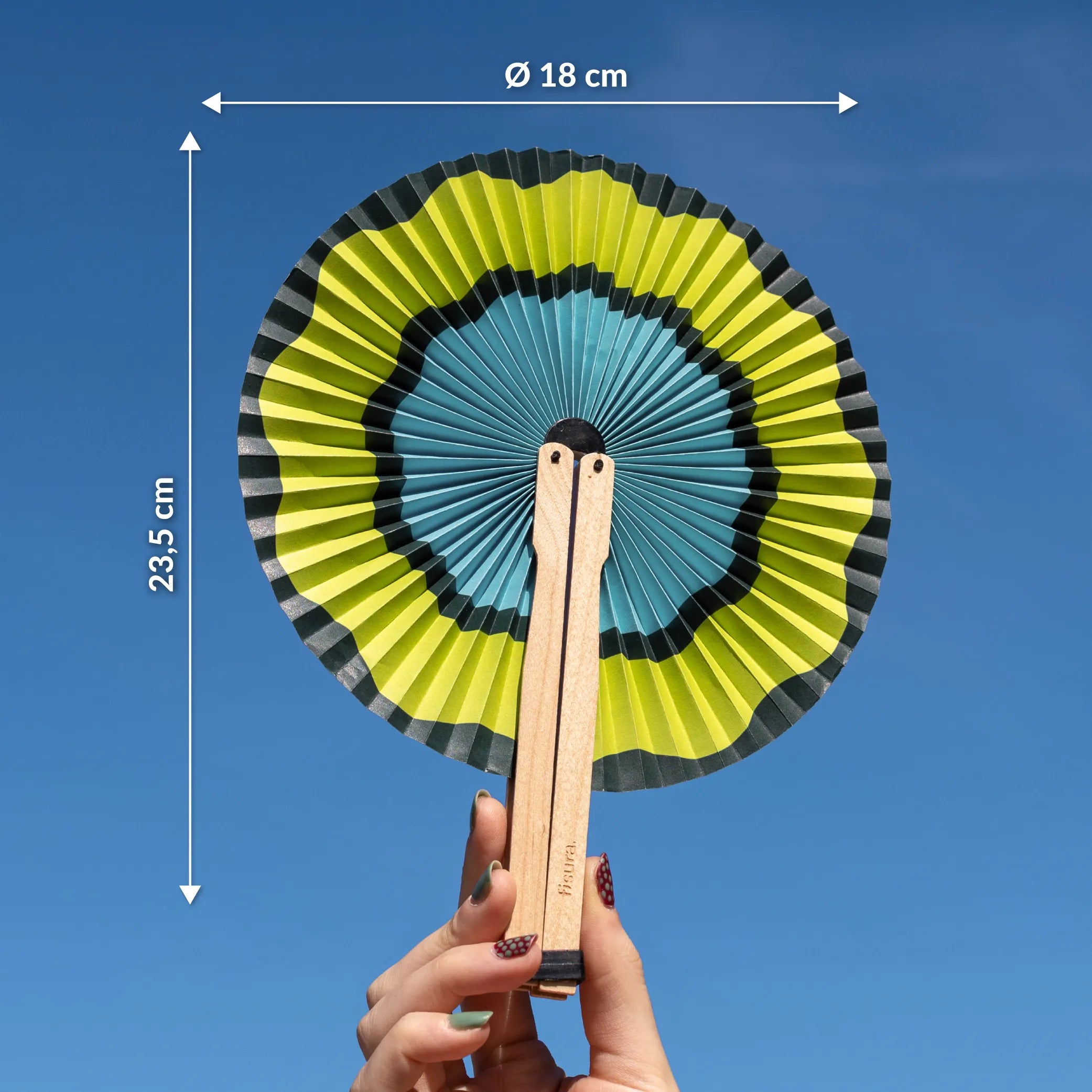 Im geschlossenen Zustand hat der Pai-Pai-Fächer eine Länge von 15 cm. Damit passt er problemlos in deine Handtasche oder in die Hosentasche und ist unterwegs jederzeit einsatzbereit, wenn die Temperaturen steigen.