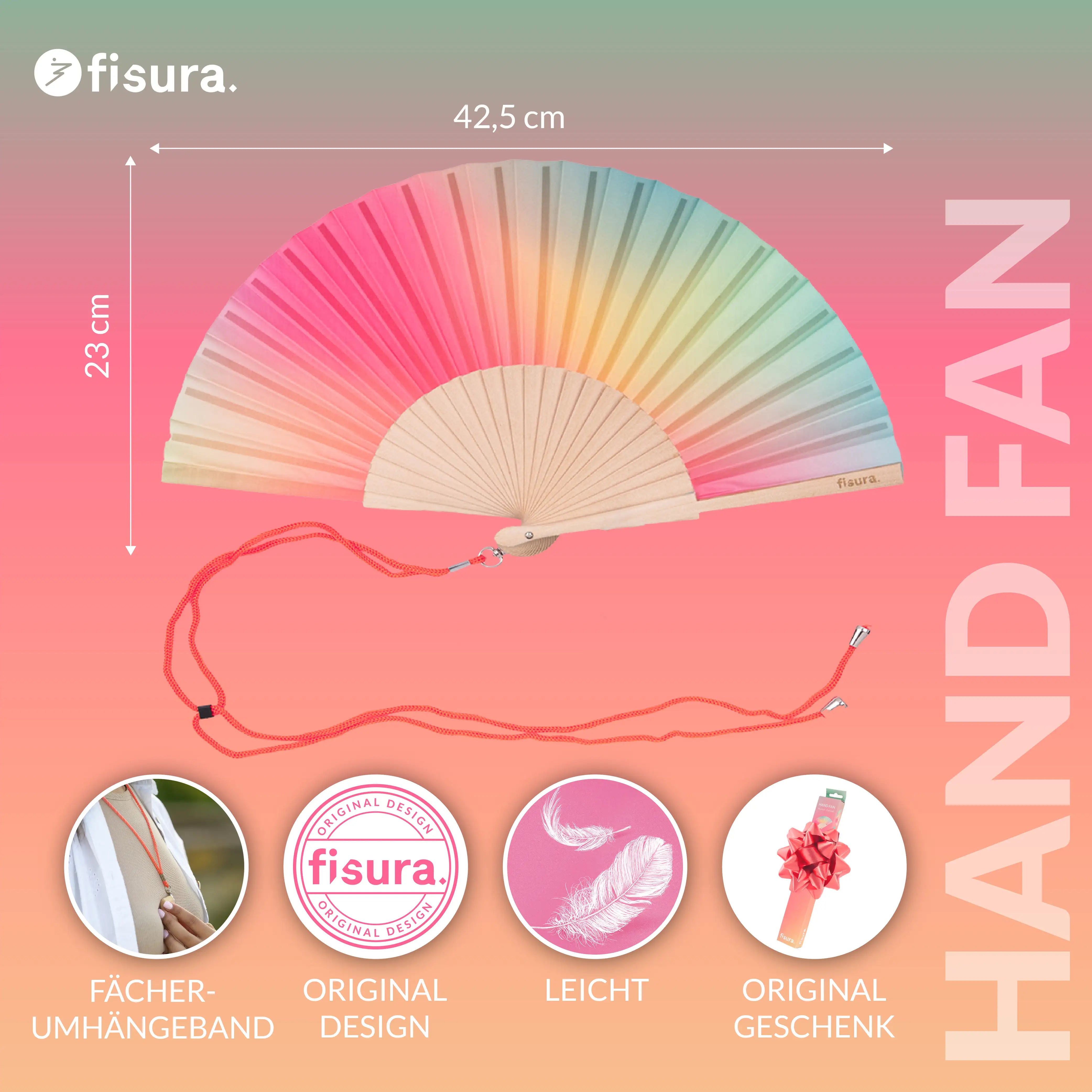 Dieser Handfächer mit Farbverlauf in Rosatönen und Grüntönen unterstützt dich an heißen Tagen und bei starker Sonne. Er ergänzt sommerliche Outfits um eine funktionale und farbige Komponente. Zusätzlich ist ein praktischer Anhänger integriert, damit der Handfächer jederzeit griffbereit bleibt und nicht verloren geht oder vergessen wird. Einfach umhängen und ohne Suchen im Rucksack oder in der Tasche nutzen.