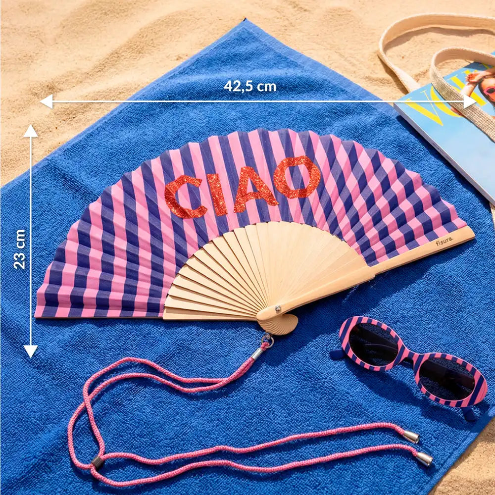 Sag Hallo und Tschüss mit diesem Handfächer mit dem Schriftzug „ciao“, der die Geste für dich übernimmt. Nimm ihn mit, klapp ihn auf und lass ihn für dich sprechen, wenn es so warm ist, dass du möglichst wenig reden möchtest.