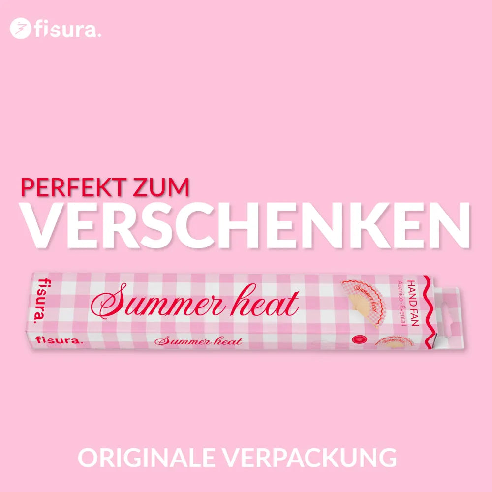 Wenn du hohe Temperaturen magst, zeigt dieser Handfächer mit dem englischen Schriftzug „summer heat“ das direkt nach außen. Aufklappen, für Luftzug sorgen und gleichzeitig klar machen, dass Sommerabende auf der Terrasse, lange Gespräche und ausgedehnte Treffen zu deinem Alltag gehören.