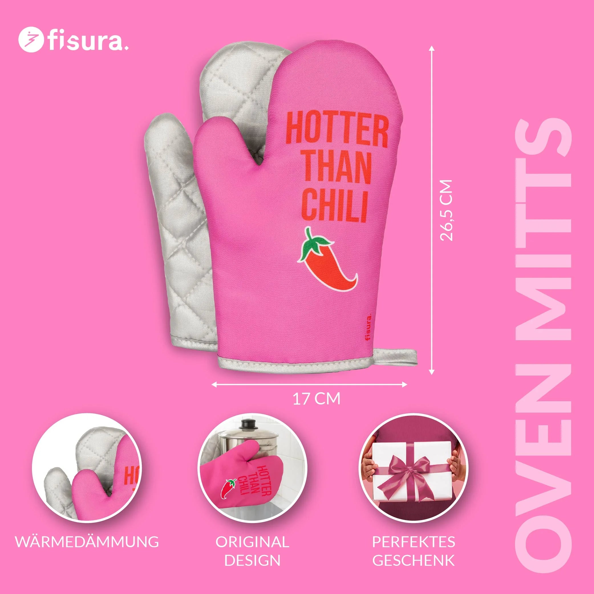 Mit dem Aufdruck „hotter than chili“ zeigen diese Ofenhandschuhe nicht nur ihre Hitzebeständigkeit, sondern machen deutlich, dass dein Essen heute besonders scharf ausfällt.