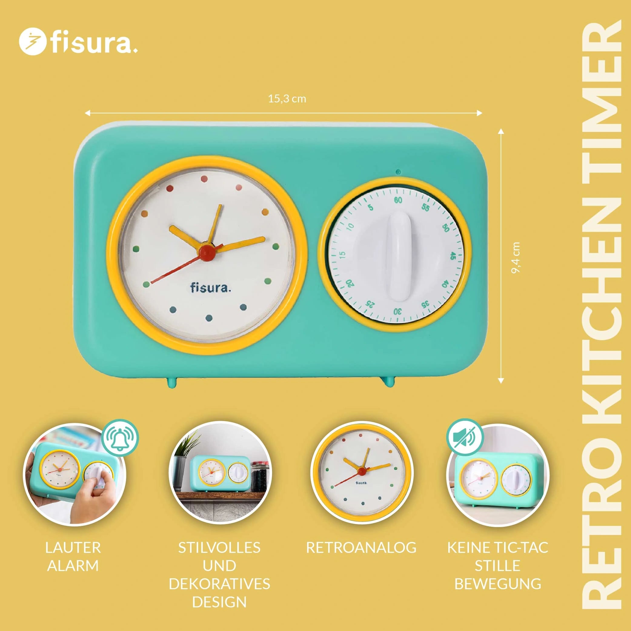 Mit seinem Design in Mintgrün und Gelb wird dieser analoge Küchentimer im Retro-Look zum Blickfang und gibt deiner Küche oder deinem Schreibtisch einen klaren Vintage-Akzent.