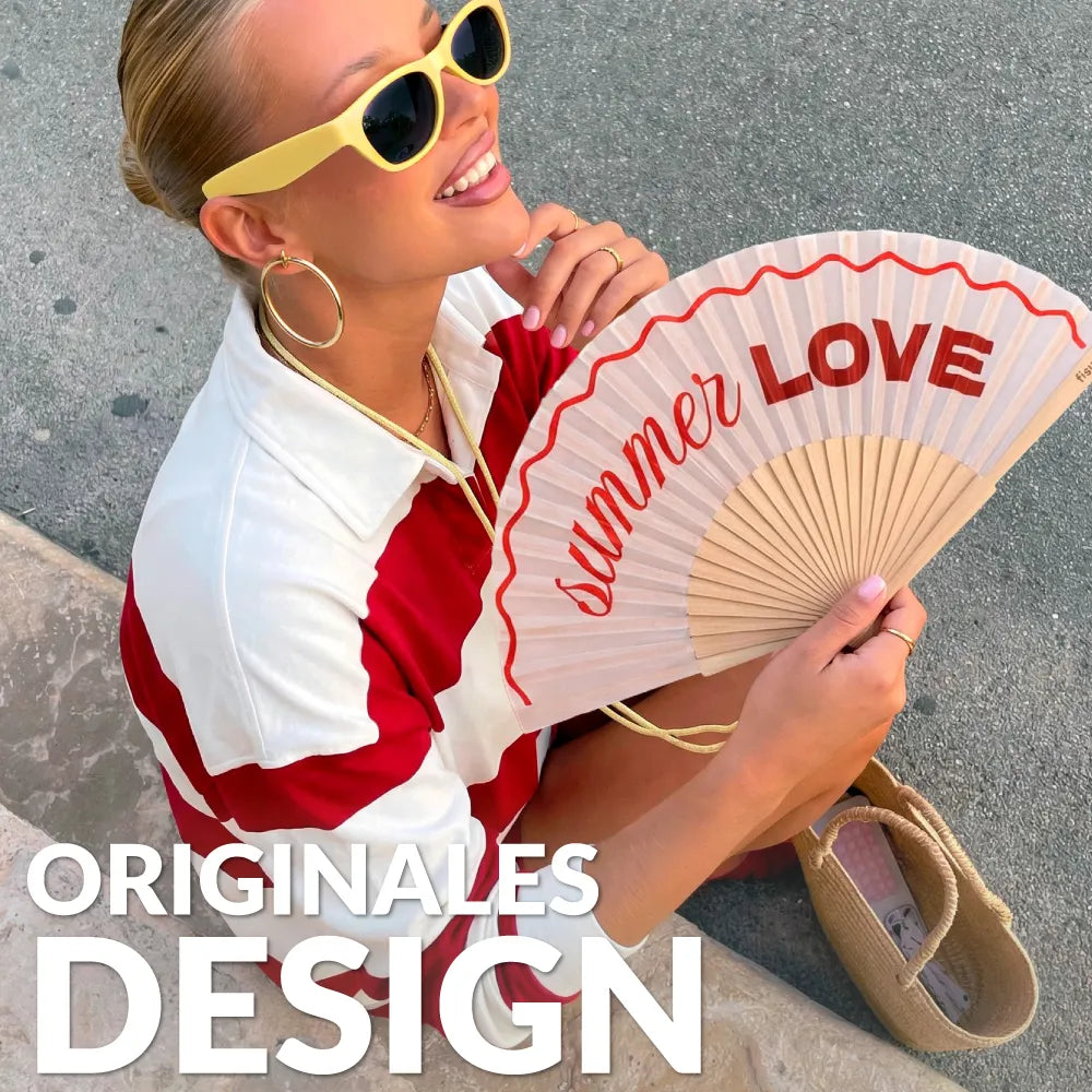 Die Kombination aus rotem Schriftzug und beigem Fächerstoff passt zu vielen Outfits und setzt einen klaren, sommerlichen Akzent. Ein integrierter Aufhänger sorgt dafür, dass der Handfächer immer griffbereit bleibt und nicht in Tasche oder Rucksack verschwindet.