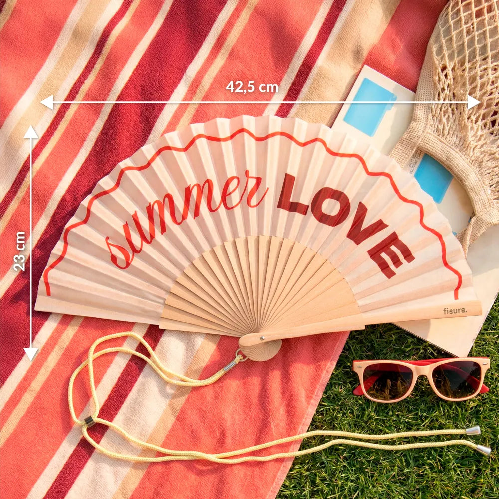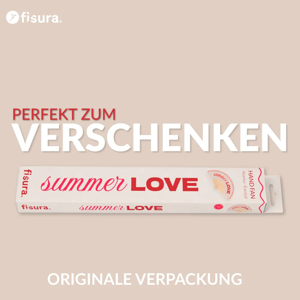 Dieser Handfächer mit dem Schriftzug „summer love“ ist für alle, die den Sommer konsequent verlängern möchten. Aufklappen, für Luftzug sorgen und hohe Temperaturen im Alltag, auf Reisen oder unterwegs besser aushalten.