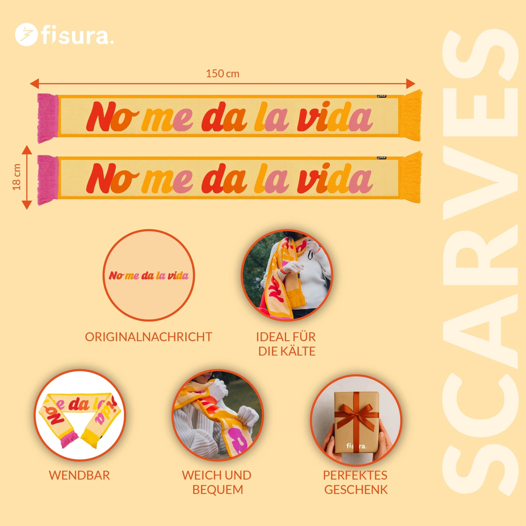 Wenn du im Alltag viel unterwegs bist und dich niedrige Temperaturen nicht ausbremsen sollen, wird dieser Schal mit dem Schriftzug „no me da la vida“ auf beiden Seiten zu einem funktionalen Begleiter in der kalten Jahreszeit. Das Gelb in Kombination mit dem mehrfarbigen Schriftzug setzt einen klaren Akzent und bringt Farbe in winterliche Outfits.