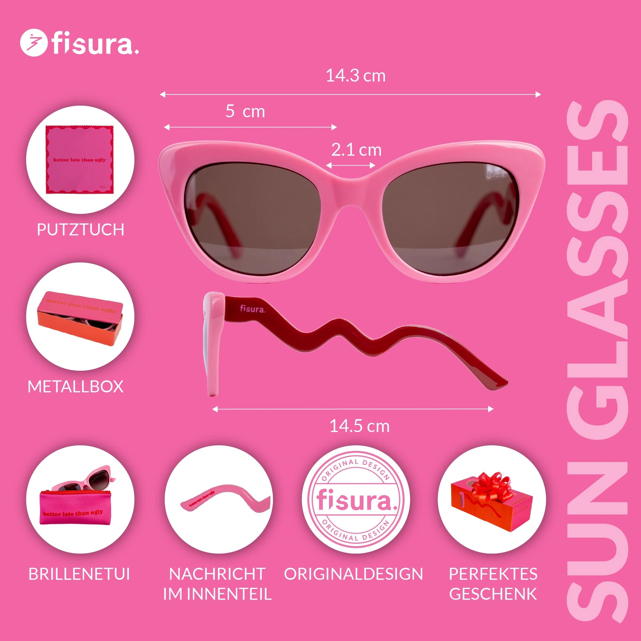 Mit dem rosa Gestell und den gewellten roten Bügeln sind diese Damen-Sonnenbrillen geeignet, deinem Outfit einen klaren, farbigen Akzent zu geben. Die Innenseite eines Bügels ist mit dem Schriftzug „better late than ugly“ versehen und erinnert daran, dass ein stimmiger Auftritt Zeit haben darf.