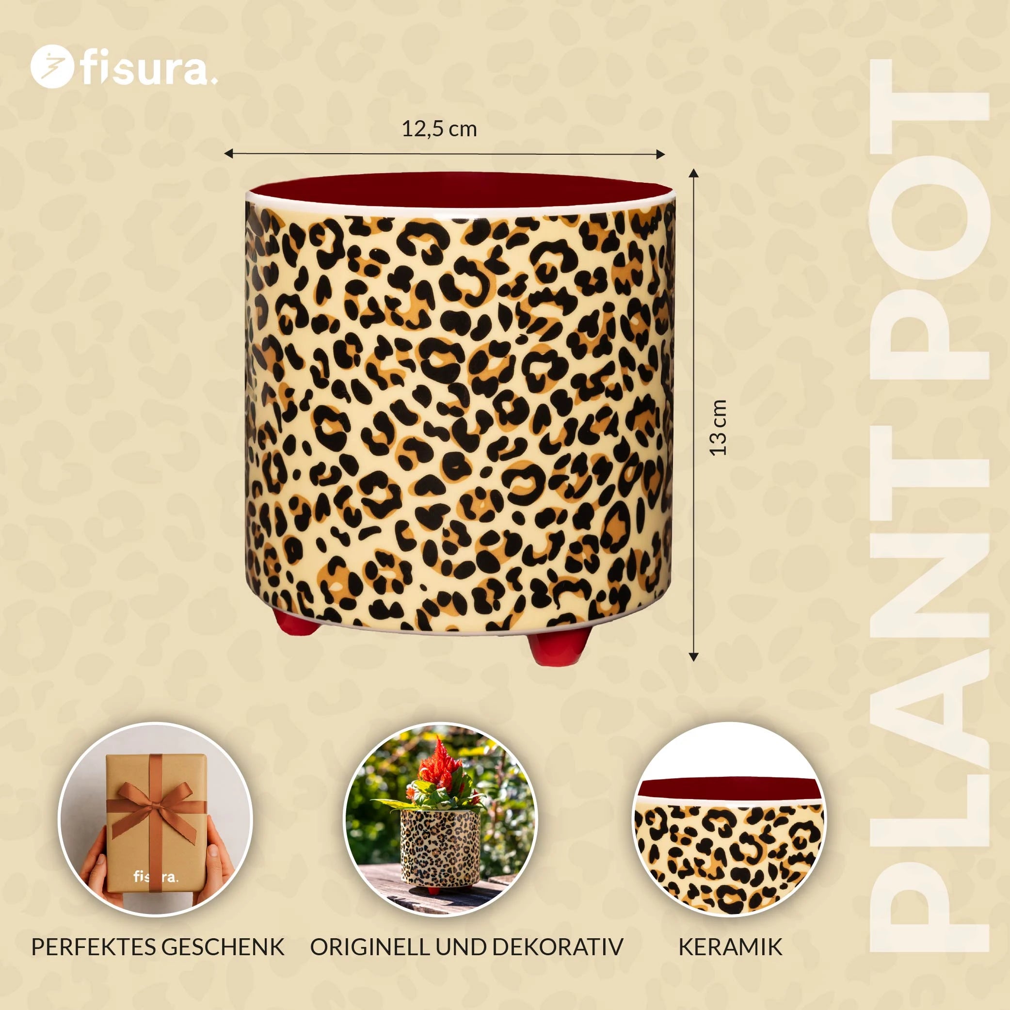 Dieser Leoparden-Blumentopf verleiht jedem Bereich deiner Wohnung eine markante, ausdrucksstarke Note. Im Wohnzimmer, Büro oder auf dem Balkon platziert, sorgt er für einen frischen Akzent, der ins Auge fällt.