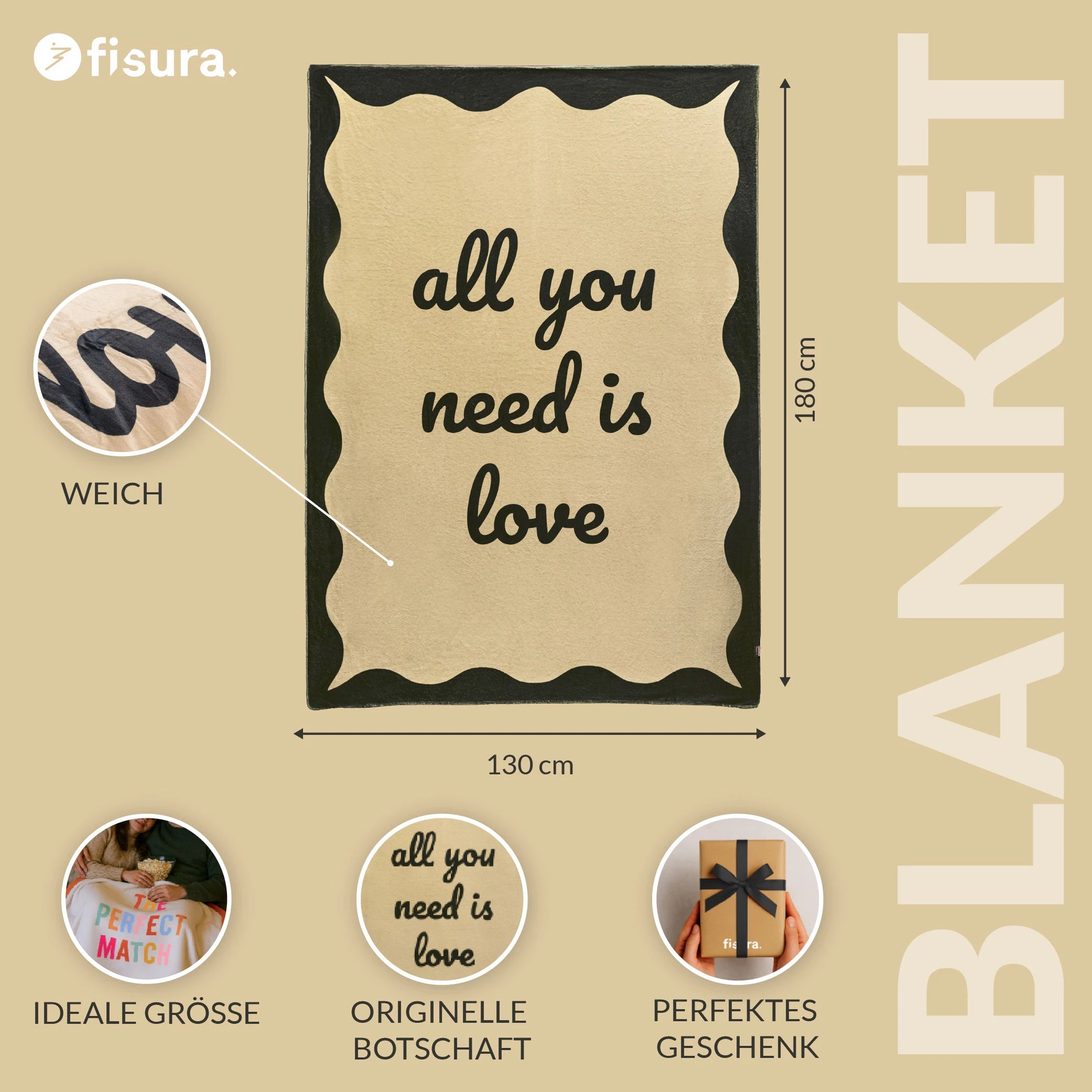 Klar formuliert: All you need is love und eine große Sofadecke, die deine Zeit auf dem Sofa funktional ergänzt. Diese große Sofadecke mit Schriftzug wärmt nicht nur, sondern bringt eine klare Gestaltung in den Raum, damit Kälte auf dem Sofa kein Thema ist.