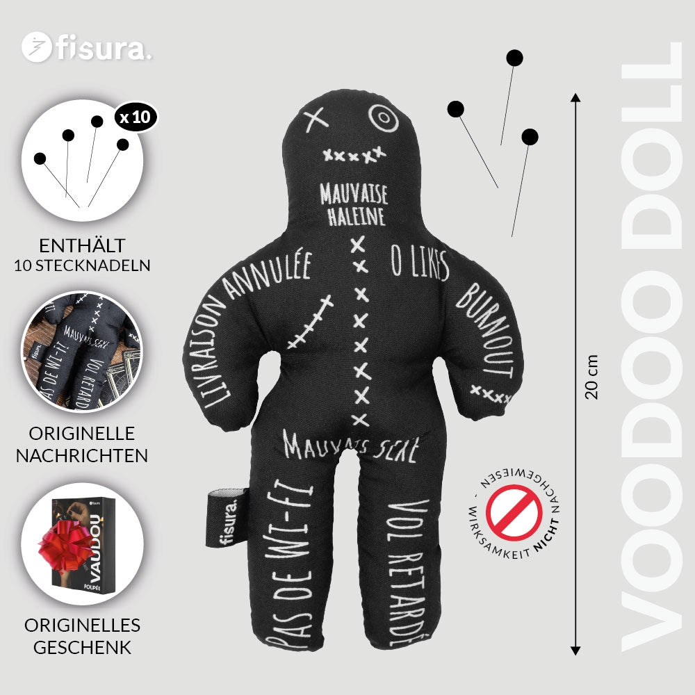 Mit französischen Sätzen wie „pas de wi-fi“, „vol retardé“ oder „gueule de bois de 3 jours“ greift diese Voodoo-Puppe typische Alltagssorgen auf, die heute oft belastender wirken als ein klassischer Horrorfilm. Inklusive 10 Stecknadeln, die du nach Belieben platzieren kannst und so deiner Kreativität oder deiner dunkleren Seite Raum gibst.