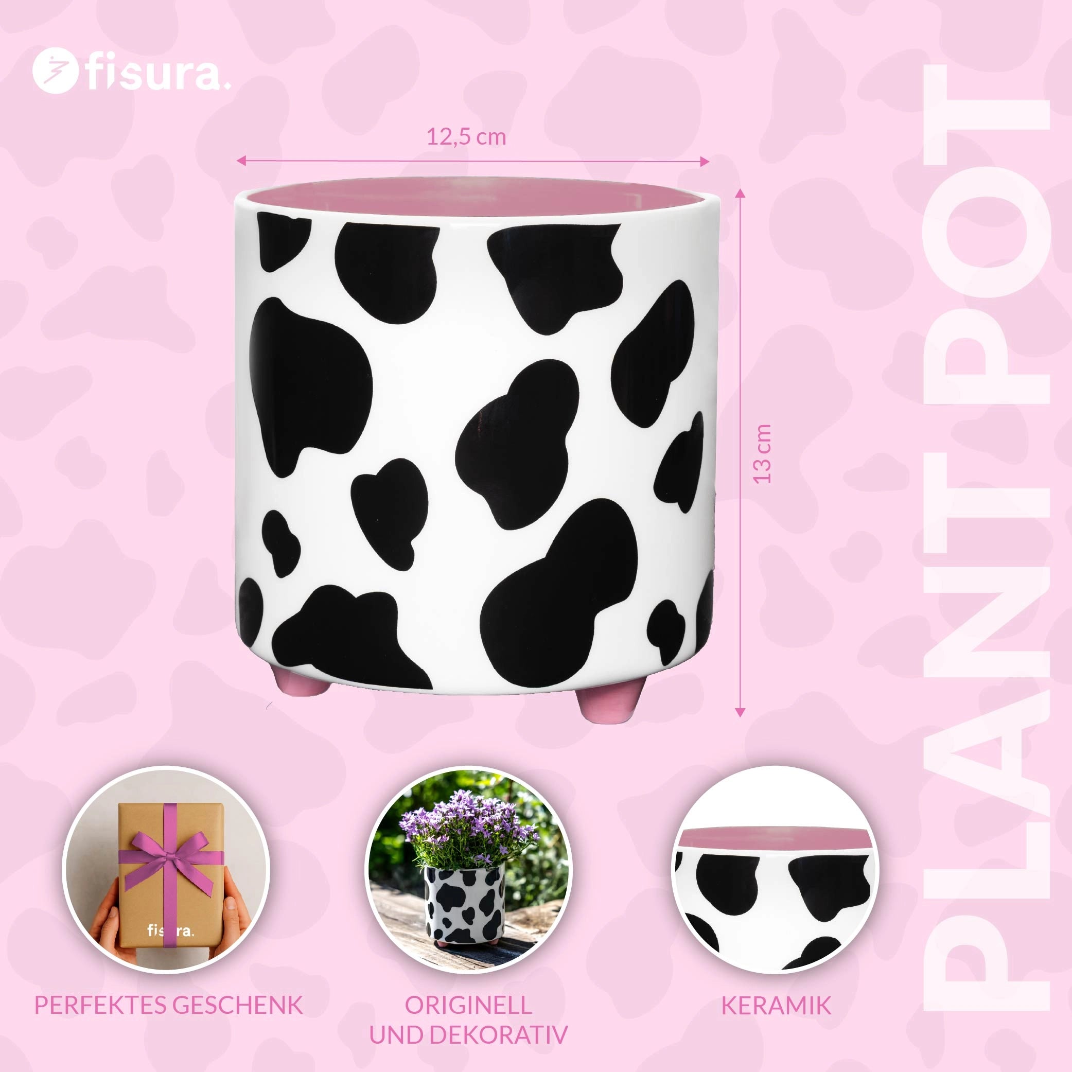 Dieser Blumentopf mit Kuhmotiv setzt einen klaren Akzent in jedem Raum. Im Wohnzimmer, Büro oder auf dem Balkon platziert, sorgt er für einen frischen Look mit markanter Optik, der sofort ins Auge fällt.