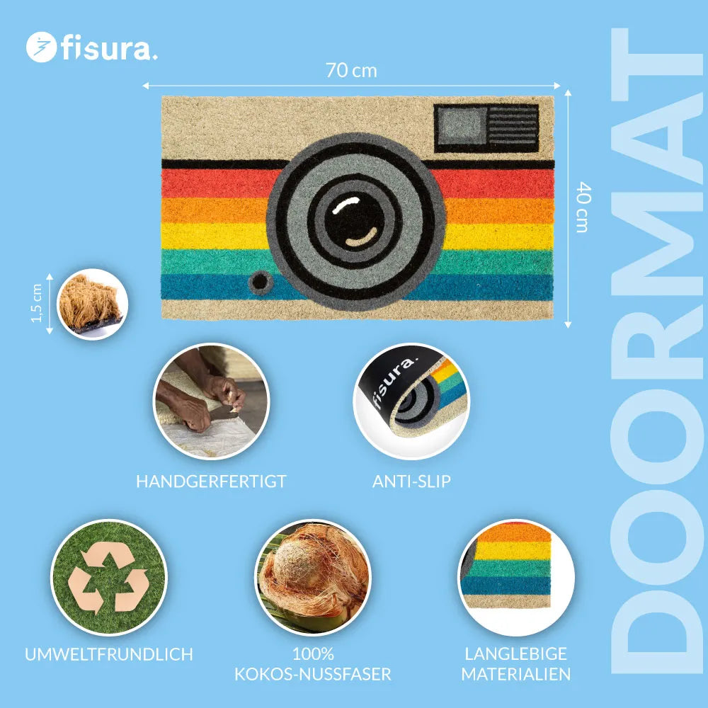 Dein Zuhause ist dein Rückzugsort. Diese Fußmatte mit Kamera-Motiv hält Schmutz draußen und setzt direkt an der Tür einen klaren Akzent.