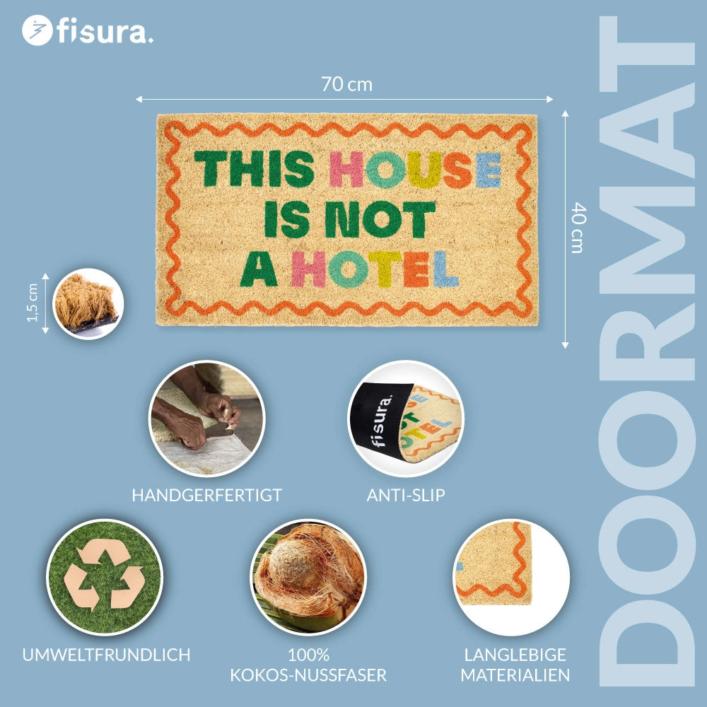 Verabschiede dich von Schmutz an den Schuhen und ungebetenen Dauerbesuchern mit dieser Fußmatte aus Kokosfaser. Mit der Aufschrift this house is not a hotel macht die Fußmatte mit Statement deutlich: In deine Wohnung geht es mit sauberen Schuhen und nicht mit Hotelanspruch.