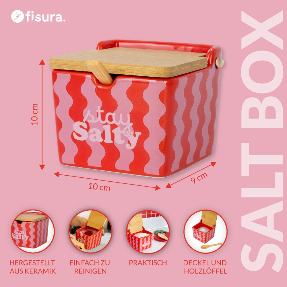 Dieser Salzbehälter für die Küche mit Wellen in Rosa und Rot und dem Aufdruck „stay salty“ bewahrt nicht nur Salz auf, sondern erinnert daran, dass ein leicht salziger Akzent das Kochen und den Alltag abwechslungsreicher macht.